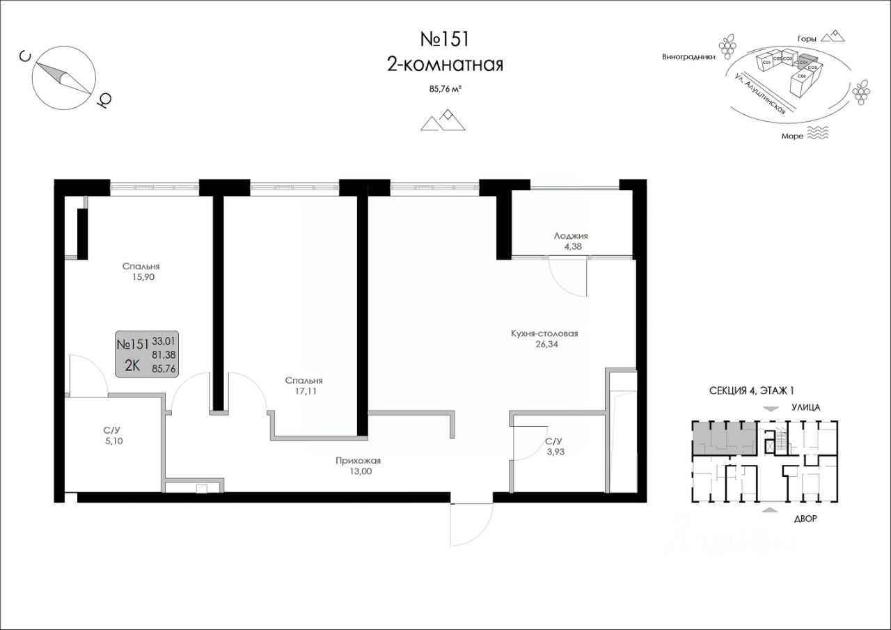 Продаётся 2-комнатная квартира в строящемся доме (Строение 1), срок сдачи: I-кв. 2027, общей площадью 85.76 кв.м., на 1 этаже.