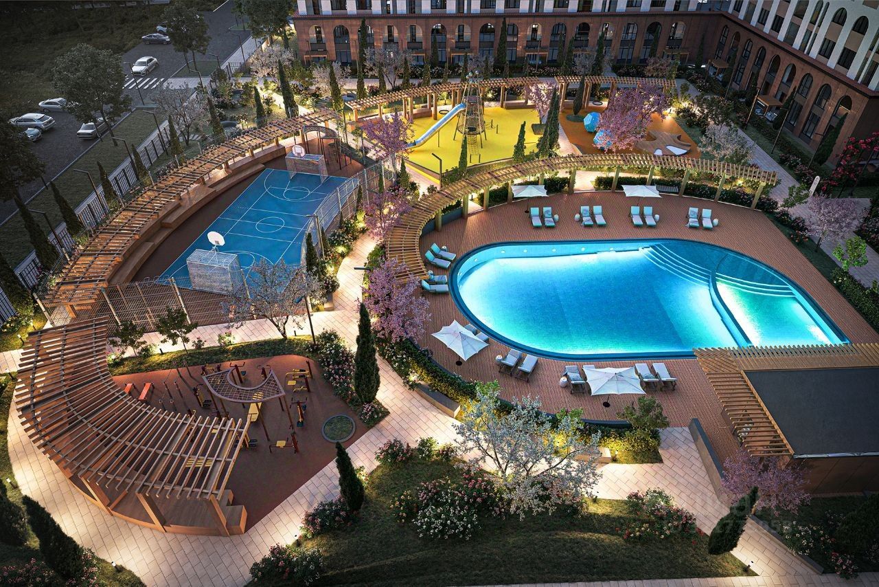 ИНФРАСТРУКТУРА - открытый бассейн с зонами отдыха и шезлонгами - собственная традиционно оборудованная баня - многофункциональная спортивная площадка и уличный workout - велосипедная дорожка по всему периметру жилого комплекса - детские площадки с безопасным покрытием - прогулочные аллеи с местами для отдыха