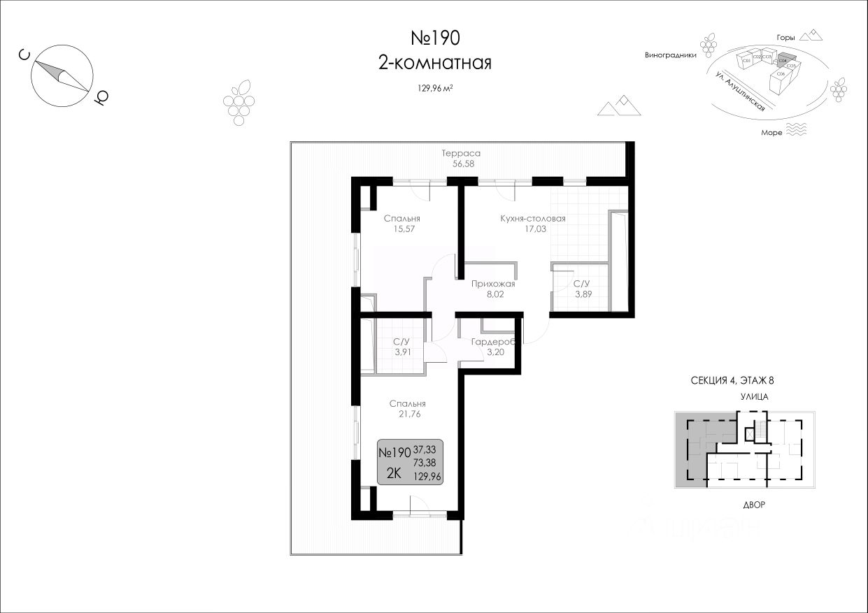 Продаётся 2-комнатная квартира в строящемся доме (Строение 1), срок сдачи: I-кв. 2027, общей площадью 129.96 кв.м., на 8 этаже.