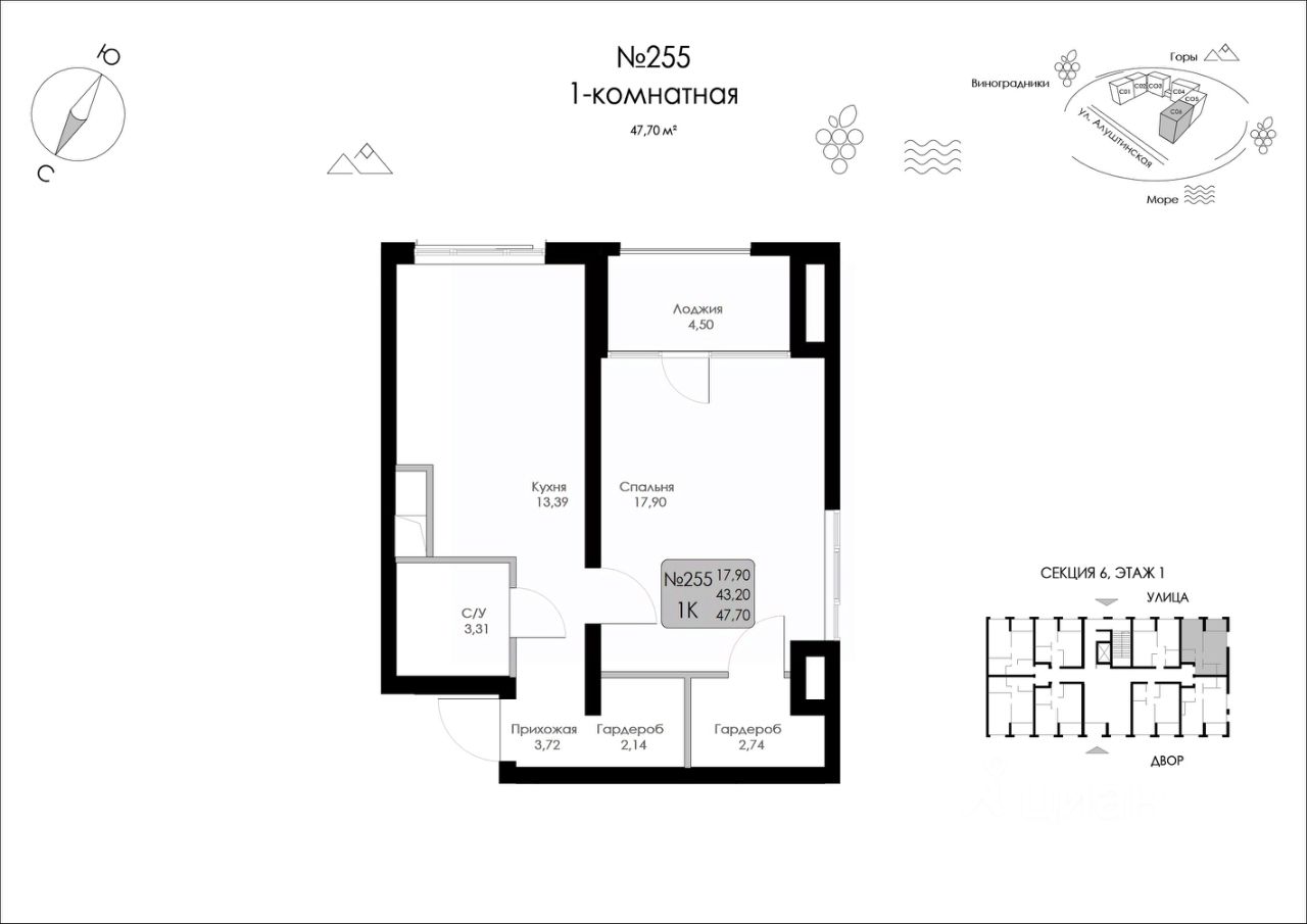 Продаётся 1-комнатная квартира в строящемся доме (Строение 1), срок сдачи: I-кв. 2027, общей площадью 47.7 кв.м., на 1 этаже.
