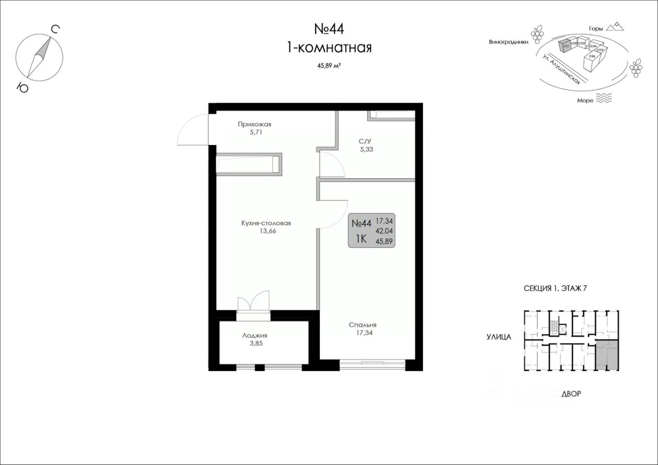 Продаётся 1-комнатная квартира в строящемся доме (Строение 1), срок сдачи: I-кв. 2027, общей площадью 45.89 кв.м., на 7 этаже.