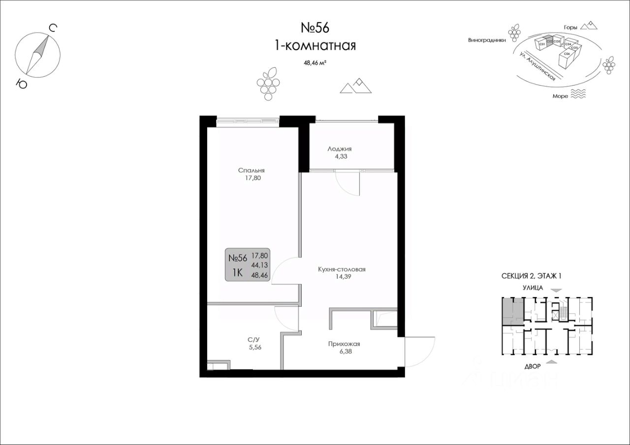 Продаётся 1-комнатная квартира в строящемся доме (Строение 1), срок сдачи: I-кв. 2027, общей площадью 48.46 кв.м., на 1 этаже.