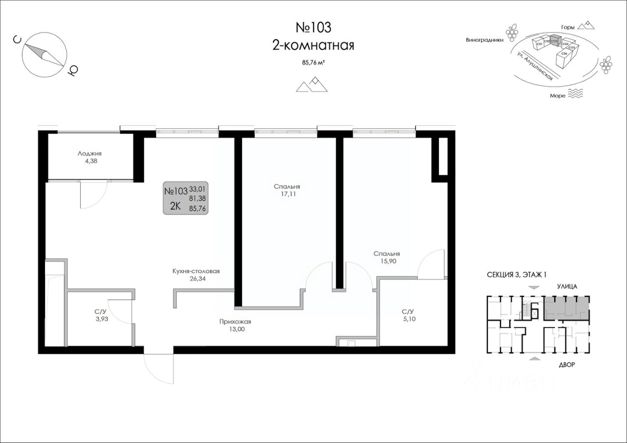 Продаётся 2-комнатная квартира в строящемся доме (Строение 1), срок сдачи: I-кв. 2027, общей площадью 85.76 кв.м., на 1 этаже.