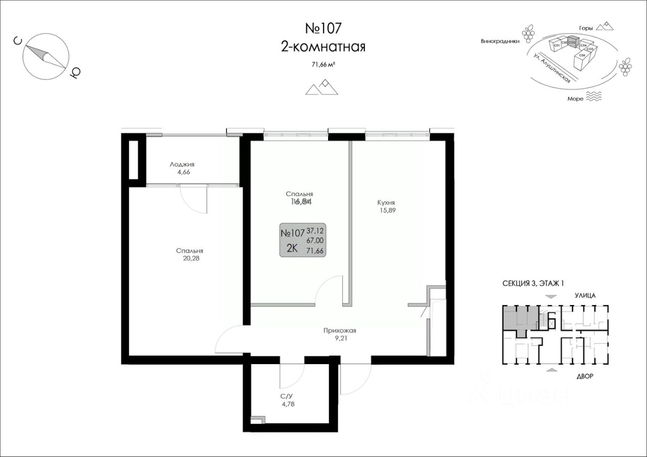 Продаётся 2-комнатная квартира в строящемся доме (Строение 1), срок сдачи: I-кв. 2027, общей площадью 71.66 кв.м., на 1 этаже.