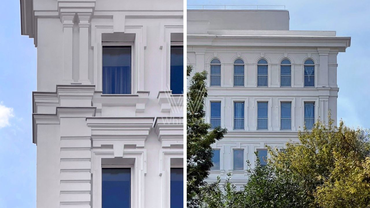 Главное о доме. Cloud Nine — ансамбль клубных домов на Золотой Миле с камерным составом резиденций. Архитектура сочетает восстановленные особняки и современные объёмы в светлом камне и стекле, французские окна и террасы выводят на зелень внутреннего сада. В лобби — натуральный камень, латунные детали, мягкий свет, стойка ресепшн и небольшие зоны для встреч. Во дворе сделали тихий сад без машин с вечерней подсветкой. На верхних уровнях встречаются пентхаусы с террасами. На первых этажах — повседневные сервисы, паркинг связывается с корпусами лифтами.