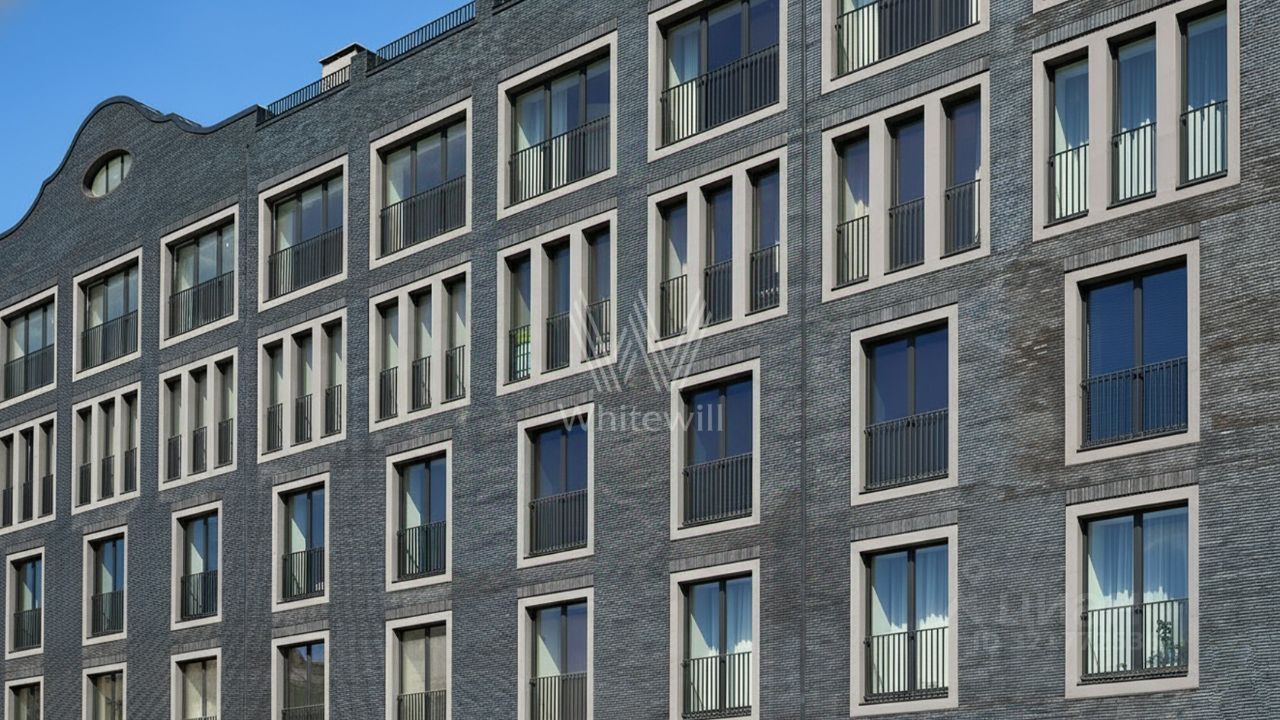 Апартаменты с дизайнерской отделкой площадью 94 м² расположены на втором этаже. В оформлении использованы фактуры дерева и гранита. Установлена кухня со встроенной бытовой техникой. Спланированы кухня-гостиная, мастер-спальня с собственной гардеробной и ванной комнатой с окном, гостевой санузел, постирочная и прихожая с гардеробной. Широкоформатные арочные окна ориентированы на две стороны света, открываются виды на благоустроенную территорию комплекса.