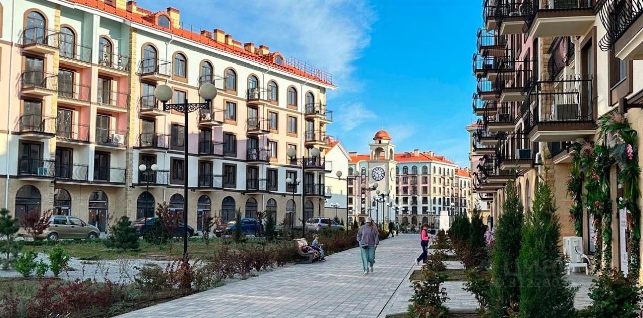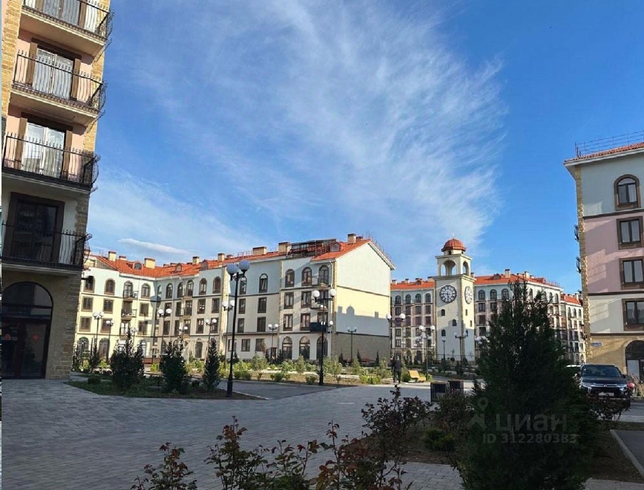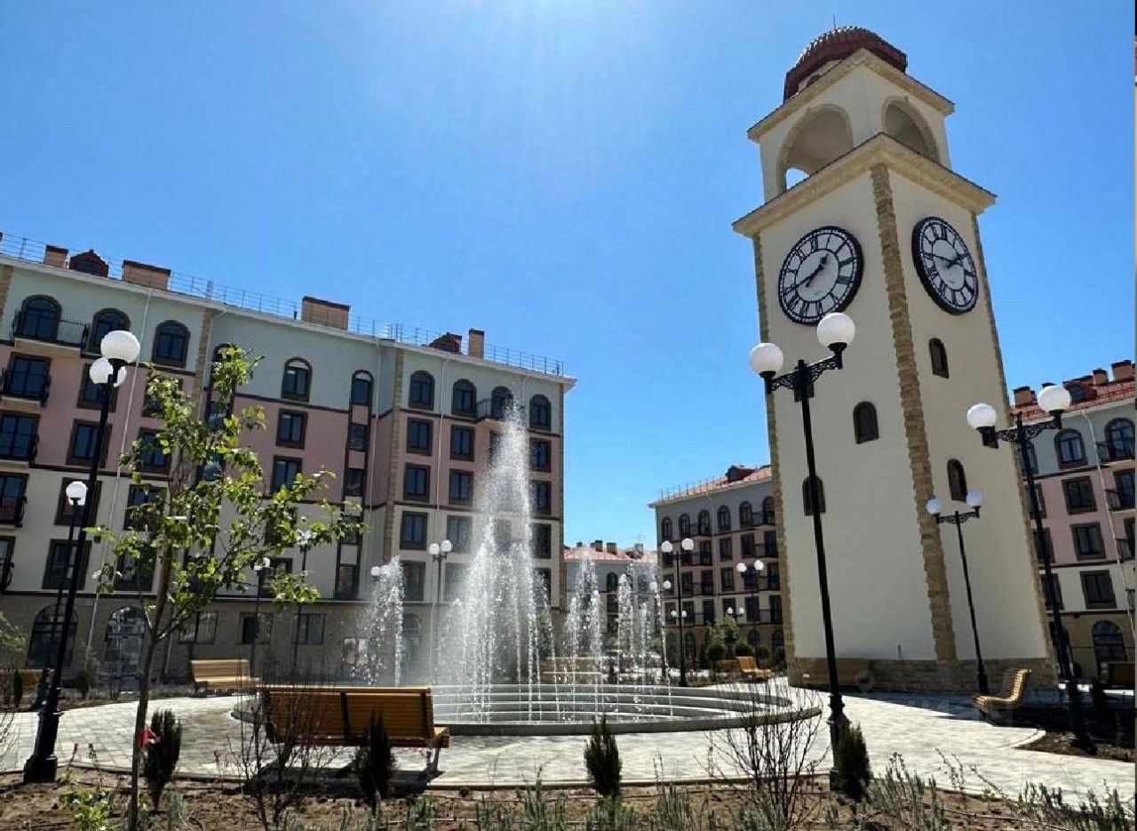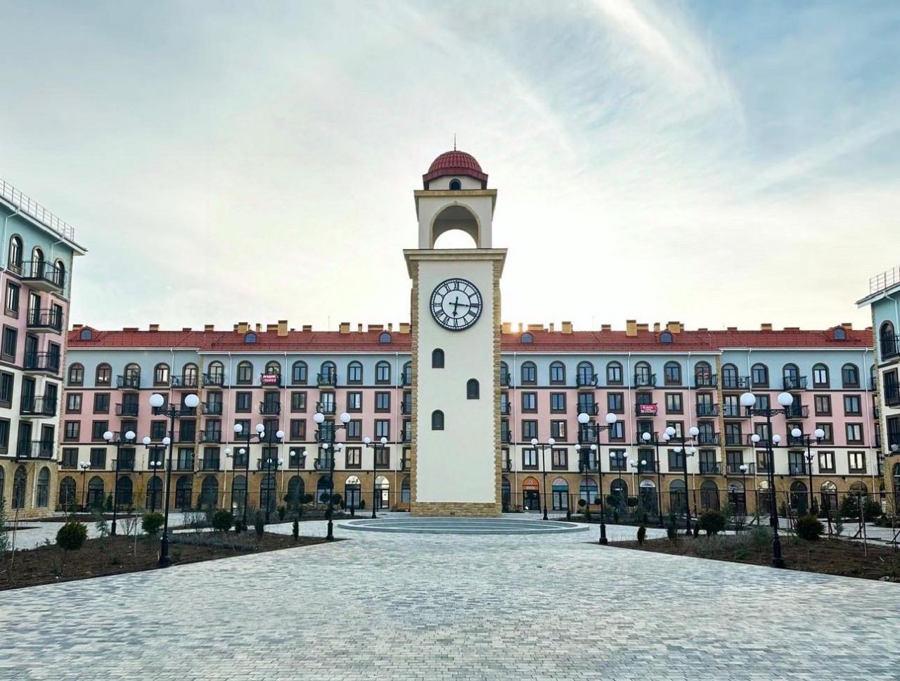 Центральная площадь с фонтаном и башней с часами придает кварталу образ европейского города.