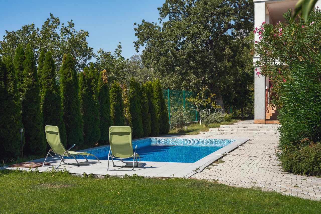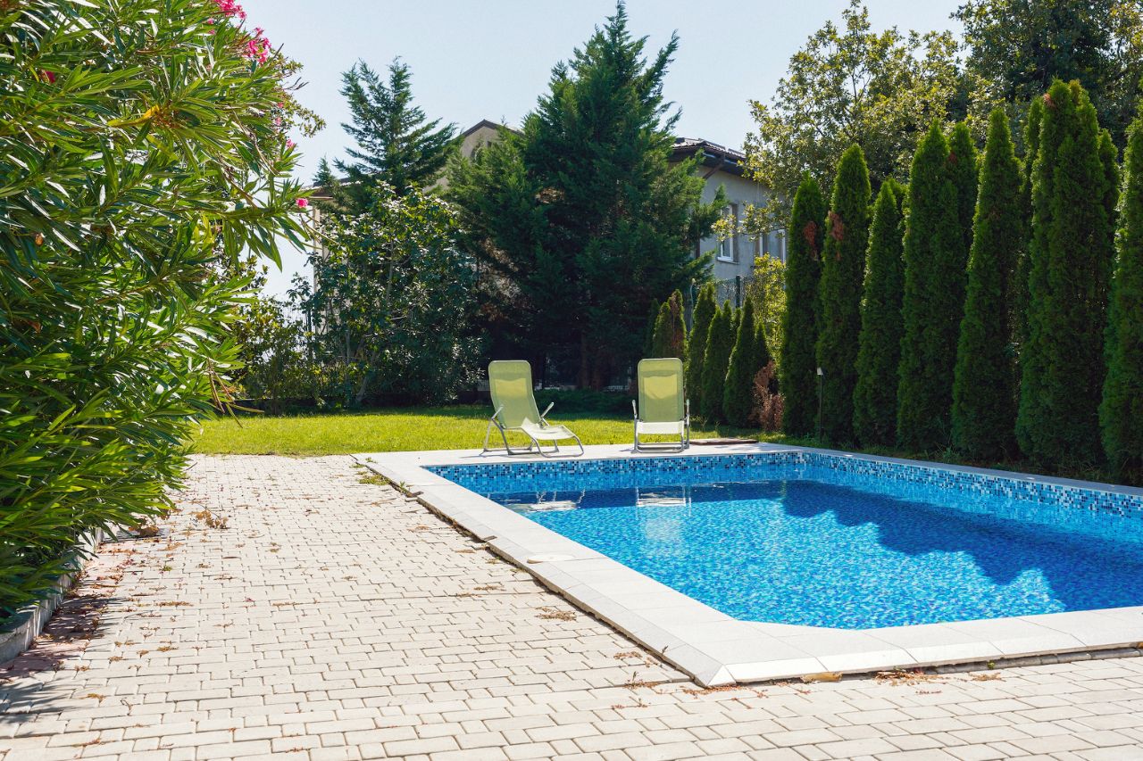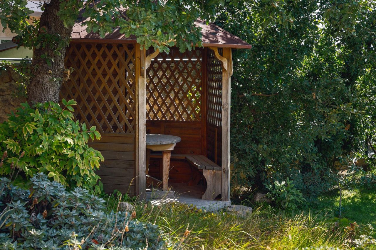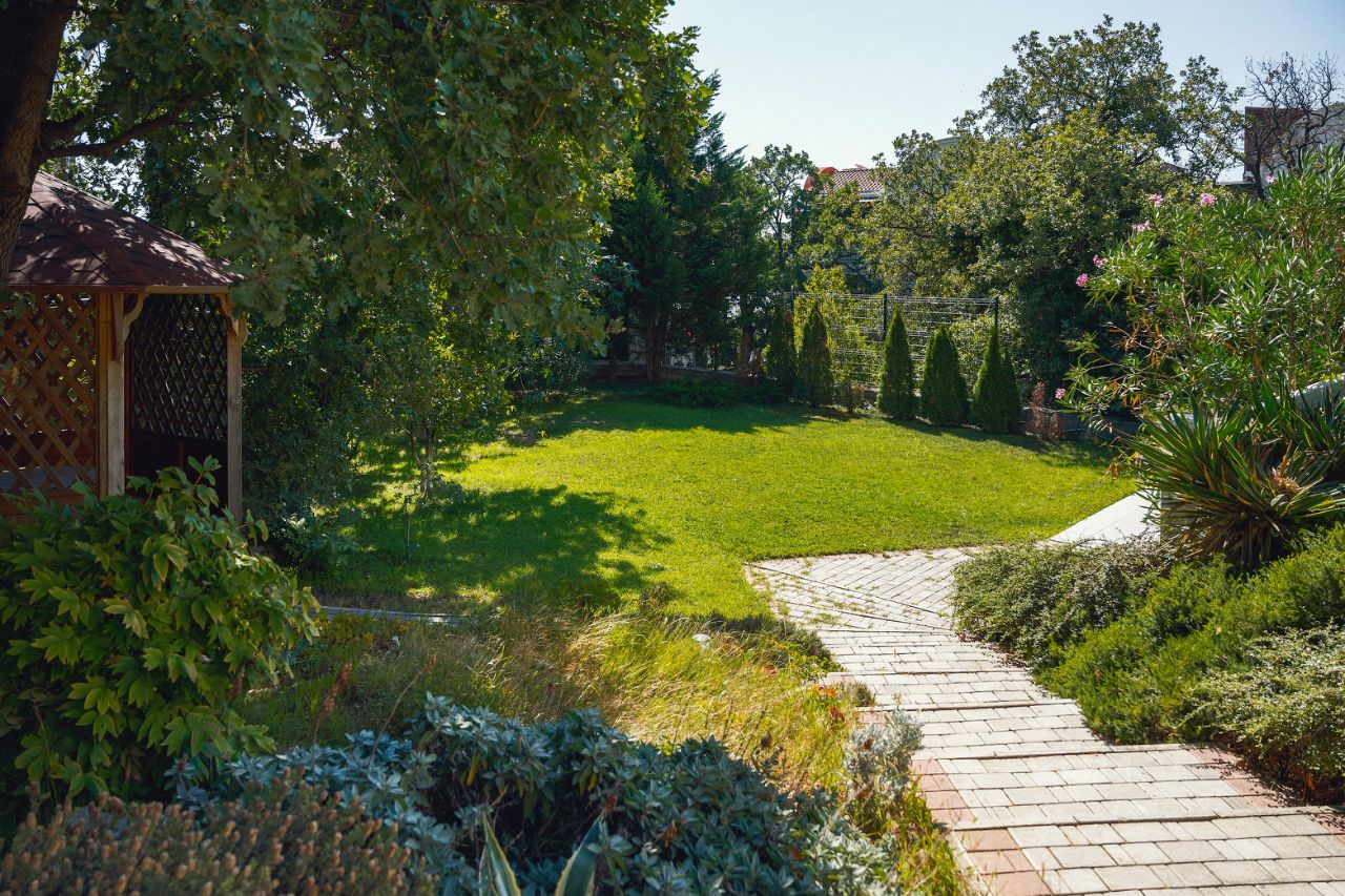 Зона отдыха: беседка, пергола с виноградом и садовой мебелью, полянка, бассейн