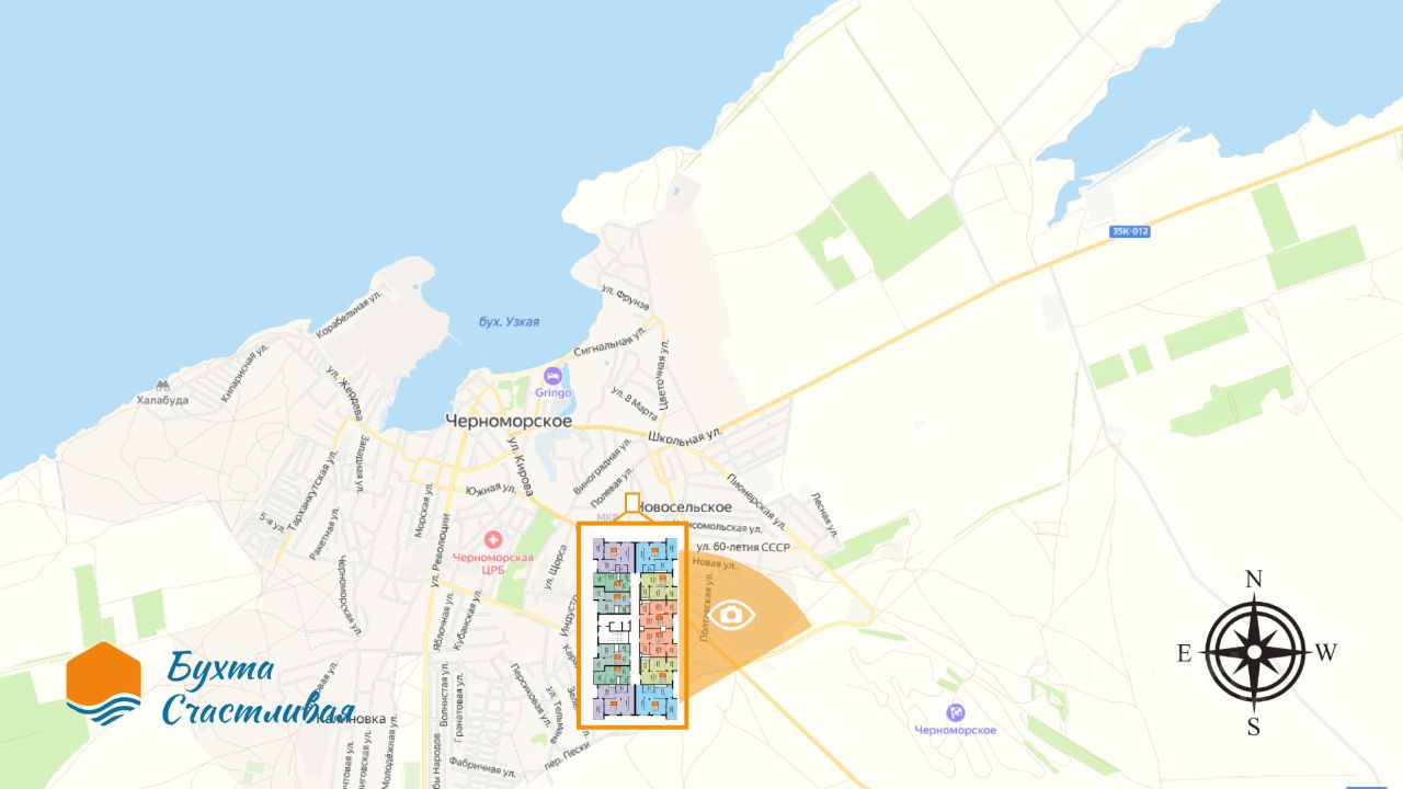 ''Бухта счастливая'' расположена в курортном поселке Черноморское, вся береговая линия района изрезана уютными бухтами, благодаря чему здесь самое богатое разнообразие пляжей в Крыму. Песчаные участки чередуются со скалистым побережьем, с гротами и плато. Именно в Черноморском районе расположены Мыс Тарханкут, Крымские Мальдивы, и многие другие. Западное побережье Крыма — новая точка притяжения. Здесь цены только начинают догонять Ялту и Сочи, что дает инвесторам преимущество, а жильцам - выбрать большую площадь, не переплачивая.