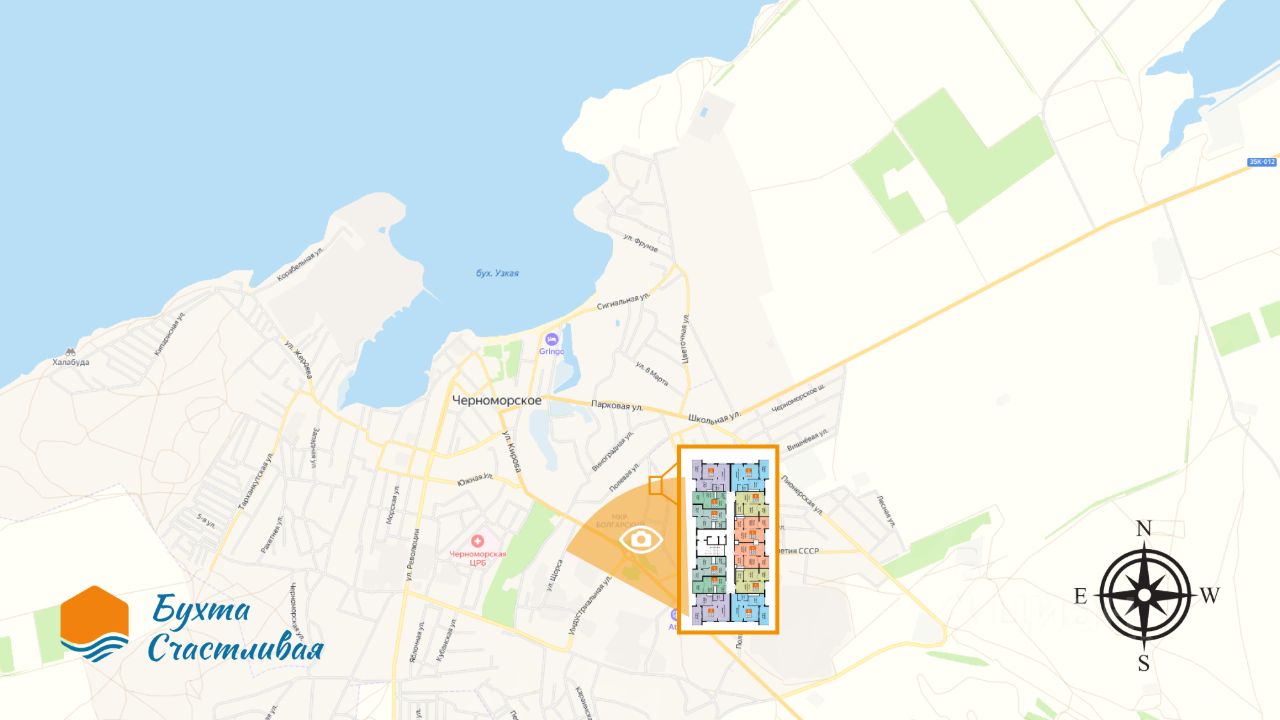 ''Бухта счастливая'' расположена в курортном поселке Черноморское, вся береговая линия района изрезана уютными бухтами, благодаря чему здесь самое богатое разнообразие пляжей в Крыму. Песчаные участки чередуются со скалистым побережьем, с гротами и плато. Именно в Черноморском районе расположены Мыс Тарханкут, Крымские Мальдивы, и многие другие. Западное побережье Крыма — новая точка притяжения. Здесь цены только начинают догонять Ялту и Сочи, что дает инвесторам преимущество, а жильцам - выбрать большую площадь, не переплачивая.