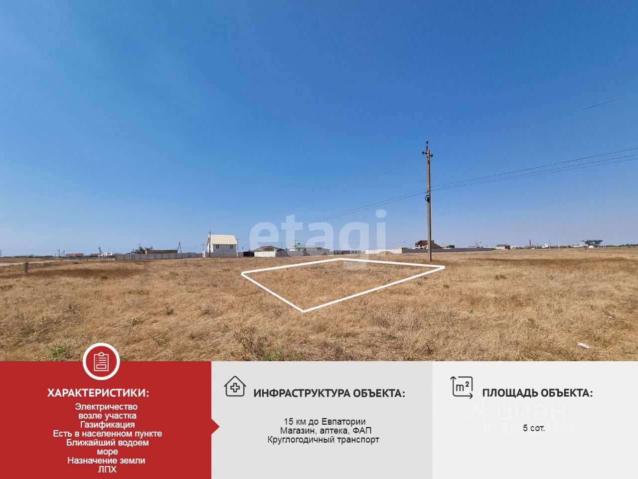 До центра Евпатории 15 км, на машине 15 минут, на автобусе 25 минут. В 1,2 км от моря. В непосредственной близости автомобильная магистраль федерального значения Симферополь - Мирный. Хорошая транспортная развязка.