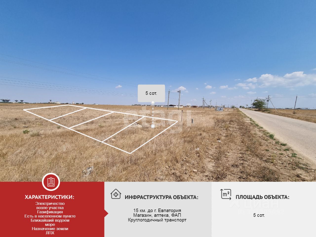 До центра Евпатории 15 км, на машине 15 минут, на автобусе 25 минут. В 1,2 км от моря. В непосредственной близости автомобильная магистраль федерального значения Симферополь - Мирный. Хорошая транспортная развязка.