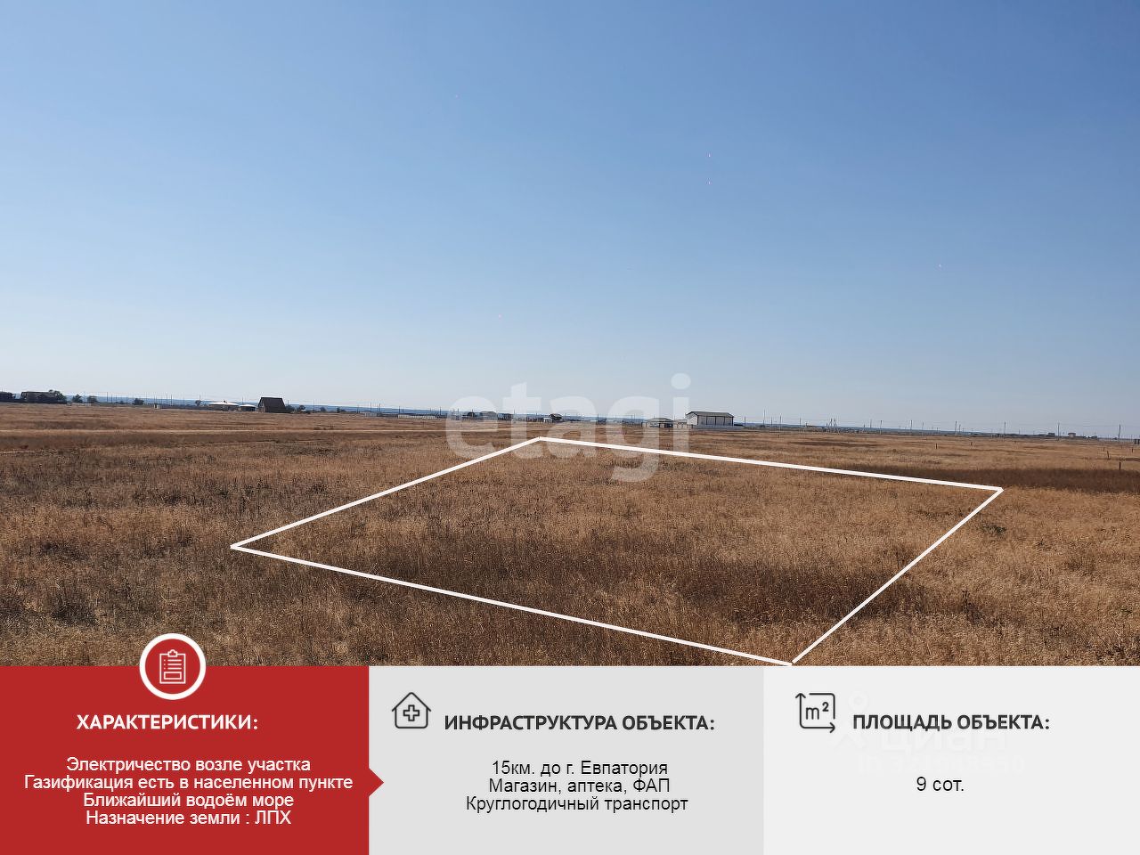 Продается участок 9,25 соток ЛПХ в Молочненское сельское поселение, Сакский район, Республика Крым рядом с Евпаторией, ровный, недалеко от моря, на территории Молочненского сельского совета.