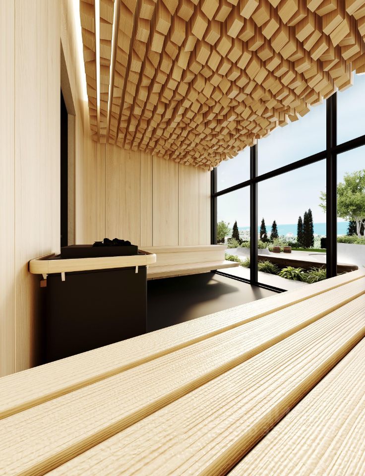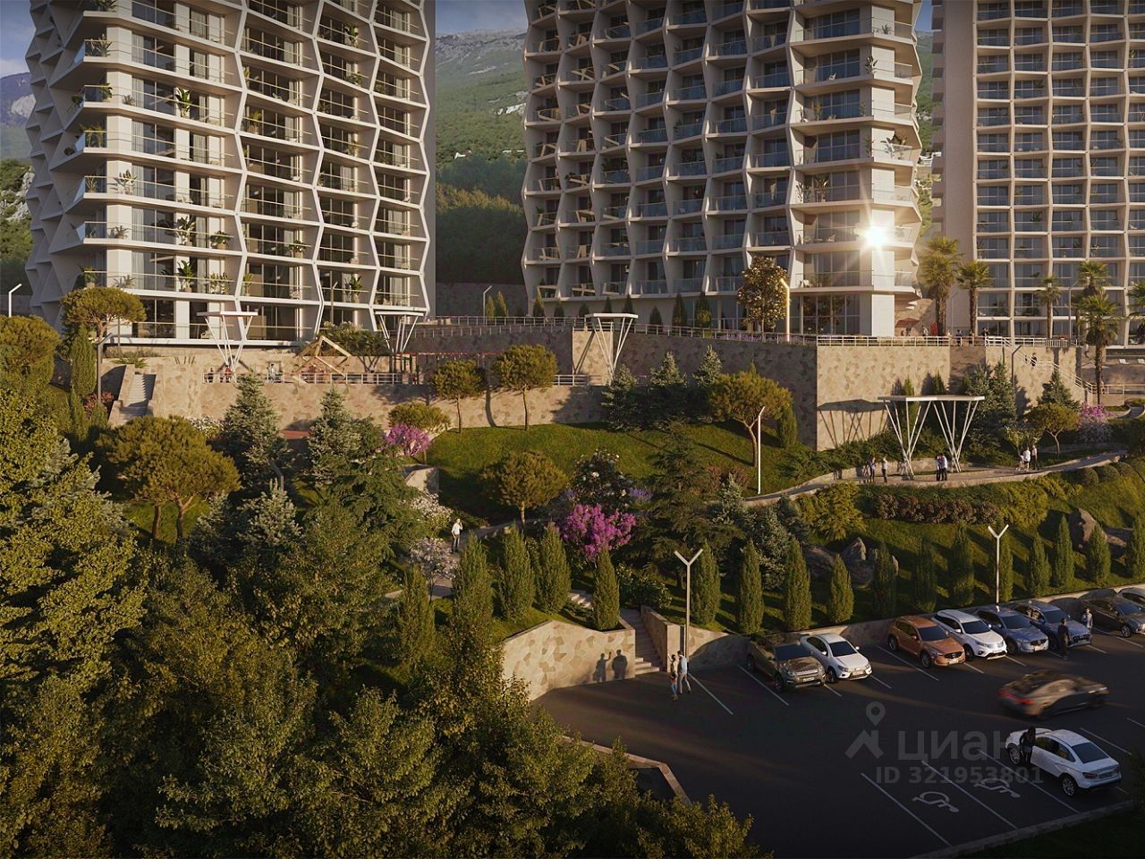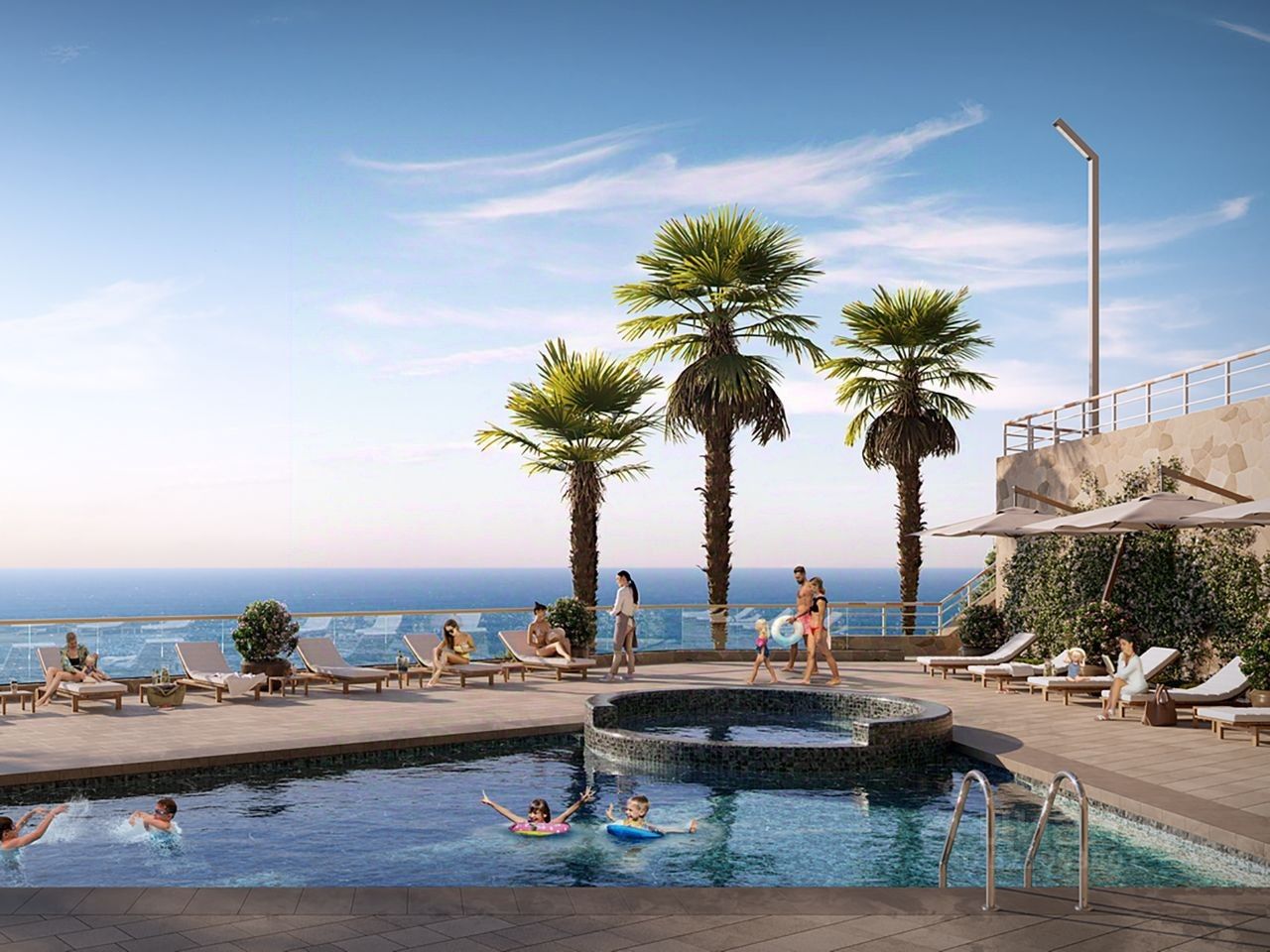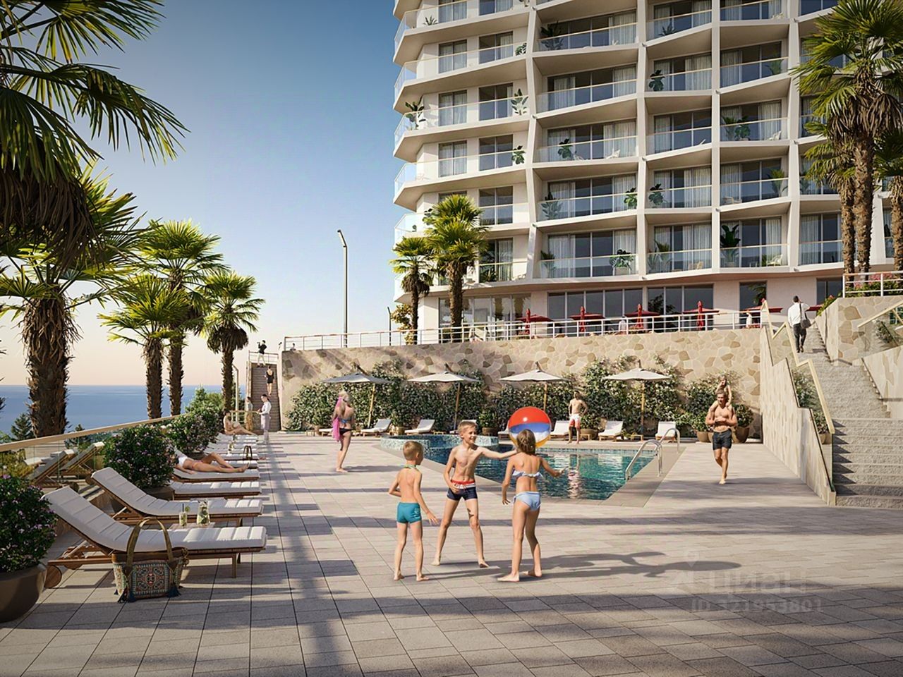 Инфраструктура комплекса: Два открытых бассейна: взрослый и детский с зоной для отдыха, Спа-центр с бассейном 500 м2, Авторский ресторан, Бизнес- зал для переговоров, Детская игровая комната и детская площадка, Спортивная площадка, Панорамные террасы общего пользования на 14 этажах Благоустроенная парковая зона с беседками и территория природного ландшафта, Зона ресепшен, Благоустроенные холлы в каждой башне, Архитектурная подсветка каждой башни, Бесшумные лифты.