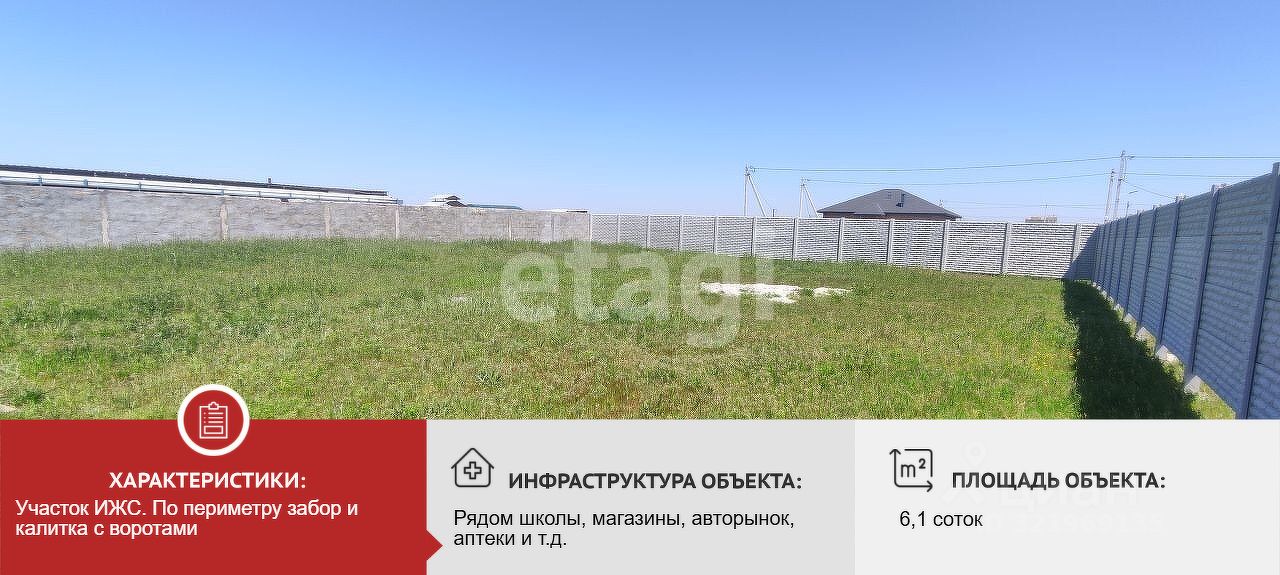 Участок 6,13 сотки. Категория земель: Земли населенных пунктов. Вид разрешенного использования: Для индивидуального жилищного строительства. Участок ровный, прямоугольной формы. По всему периметру имеется забор и калитка с воротами. Построена беседка. Посажены деревья и кустарники. Коммуникации: свет на участке, газ по границе участка, вода - скважина(в перспективе 2026 год - водопровод), интернет по границе участка.