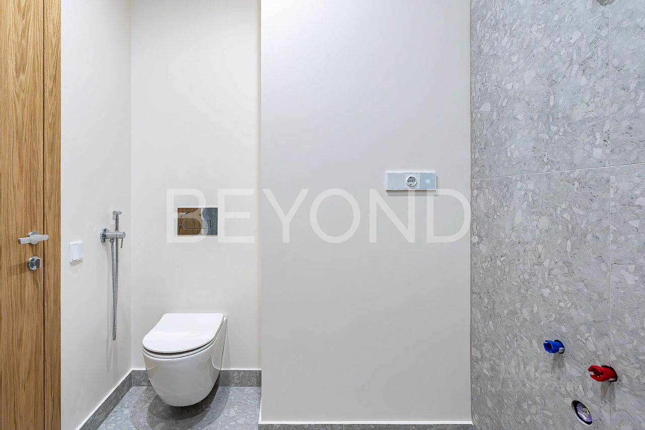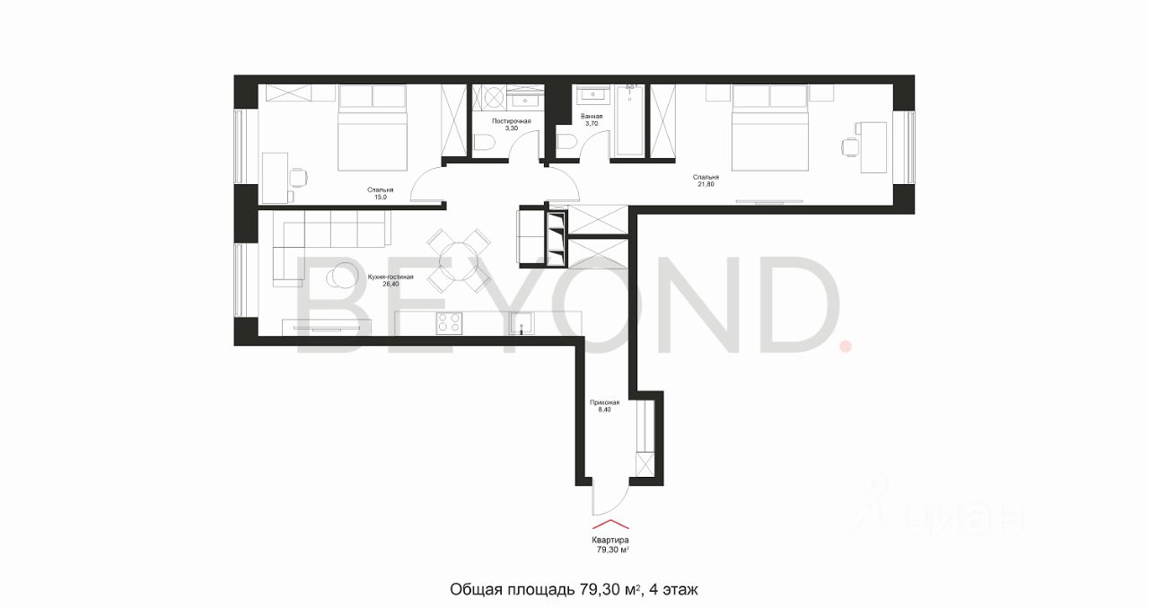Предлагается квартира площадью 79 кв. м с новой отделкой - 2 спальни. Планировка квартиры включает: светлую кухню-гостиную с зоной отдыха и обеденной группой, мастер-спальню с ванной комнатой и зонами для хранения, детскую комнату (кабинет) и гостевой санузел. Из окон гостиной и спальни открывается живописный вид на акваторию Малой Невки, а окна мастер-спальни выходят в благоустроенный внутренний двор. Спальни комфортно обособлены от холла и кухни-гостиной, что обеспечивает приватность членов семьи в любое время. В отделке использованы натуральные отделочные материалы высокого класса, а в санузлах установлена сантехника известных марок. Особое внимание уделено техническим аспектам жилья.