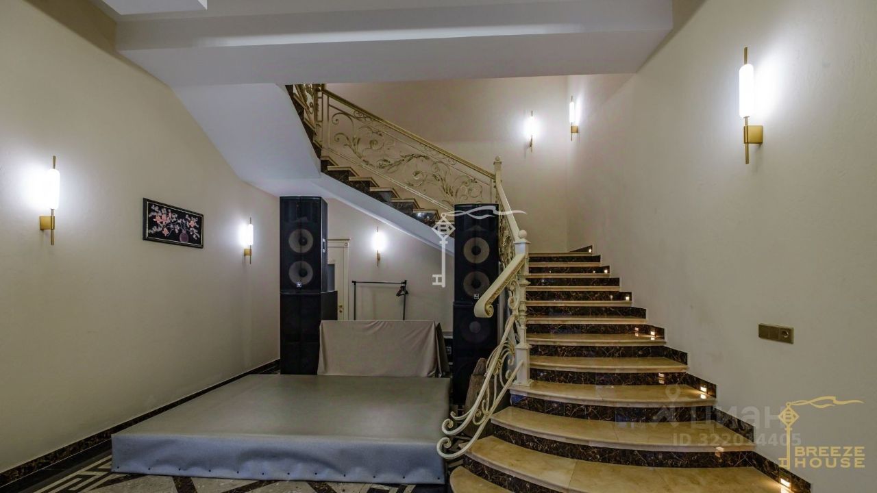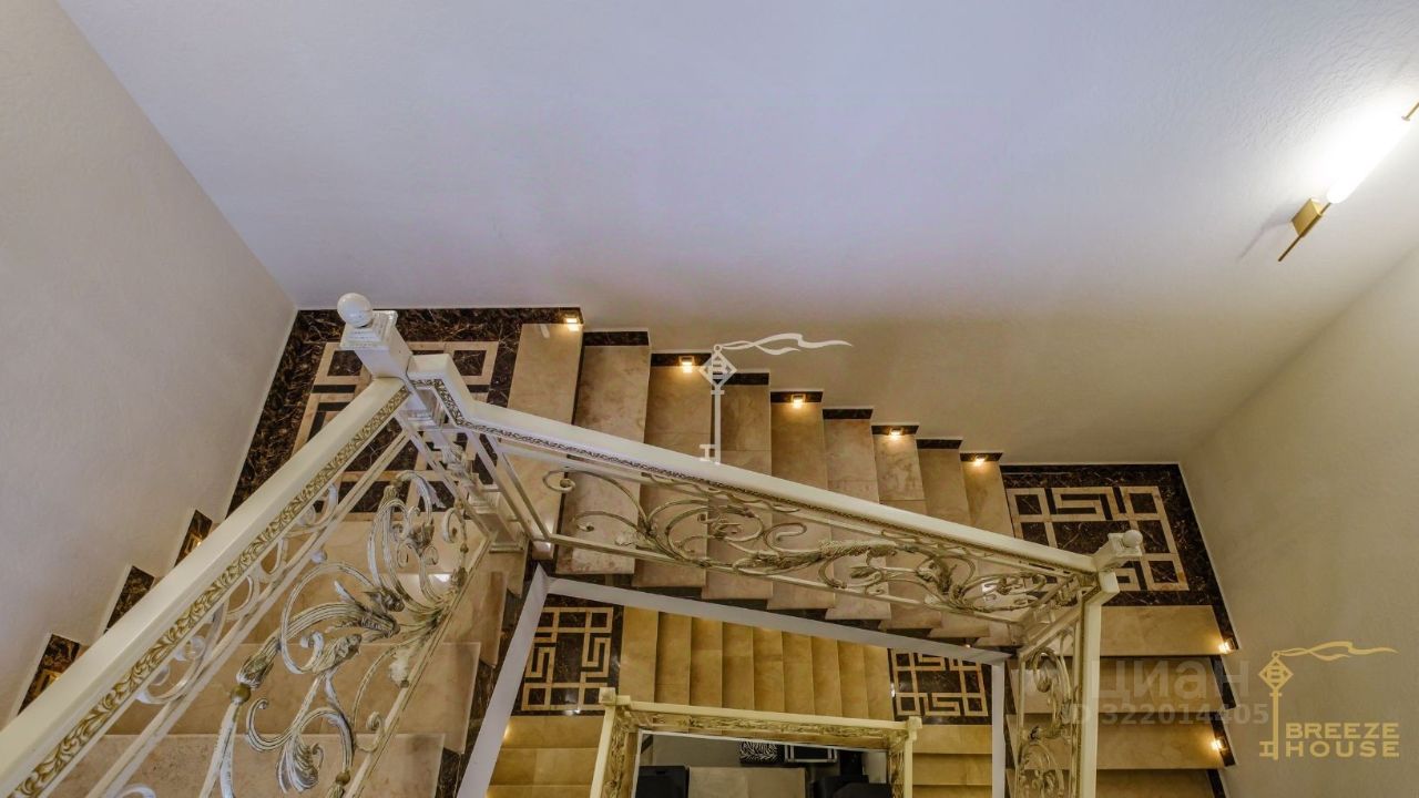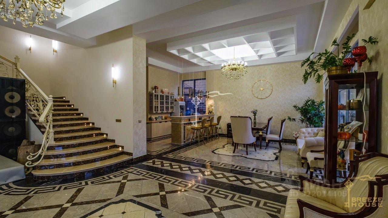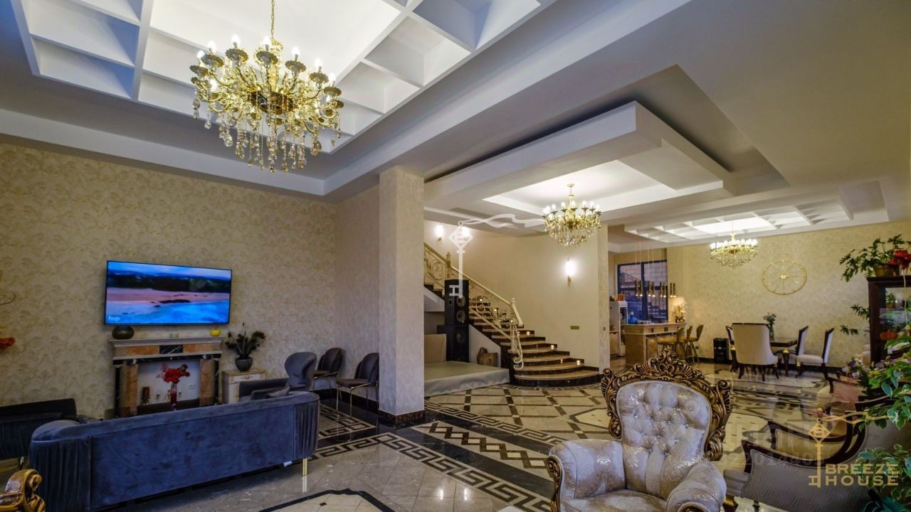 -Фасад облицован натуральным иранским травертином. -Входная группа, лестницы и перила выложены гранитом. -Лестничные проемы облицованы мрамором с декоративной подсветкой. -Кованные перила декоративной ручной работы выполнены в виде виноградной лозы. -Напольное покрытие первого этажа изготовлено в виде панно из разных видов мрамора. -Люстры завезены из Ирана.