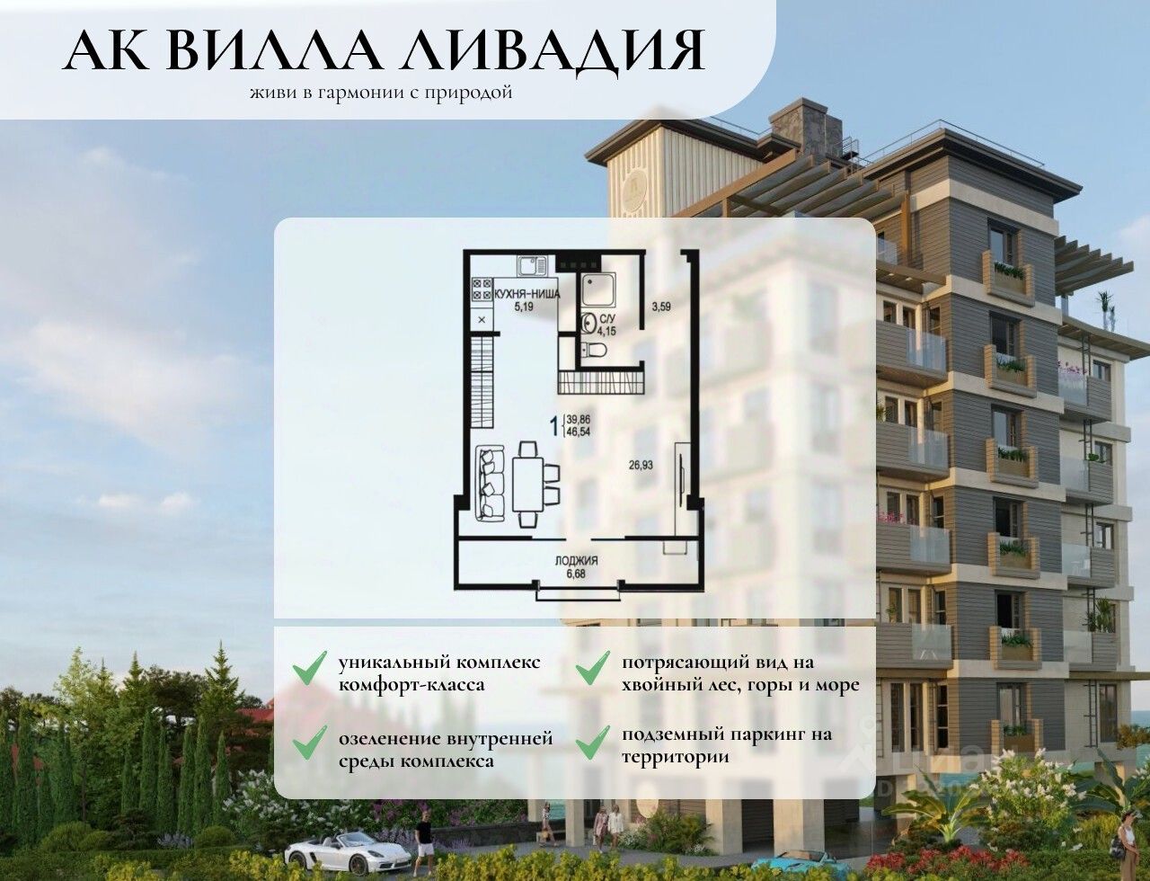 Апарт-комплекс ''Вилла-Ливадия'' выполнен в классическом южном стиле, светлые оттенки и фактура здания органично вписываются в природный ландшафт южного берега Крыма. Восемь этажей с потрясающими видами на хвойный лес, горы и море.