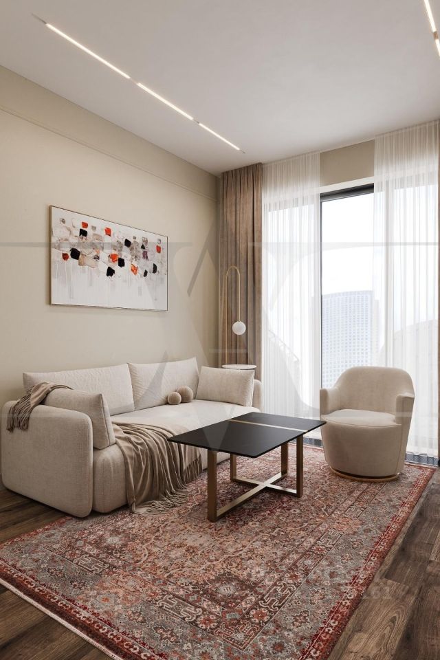Квартира с новой мебелью, кухонным гарнитуром и техникой. Планировка: кухня-гостиная, изолированная спальня, санузла и гардеробная. Высота потолков 3 метра.