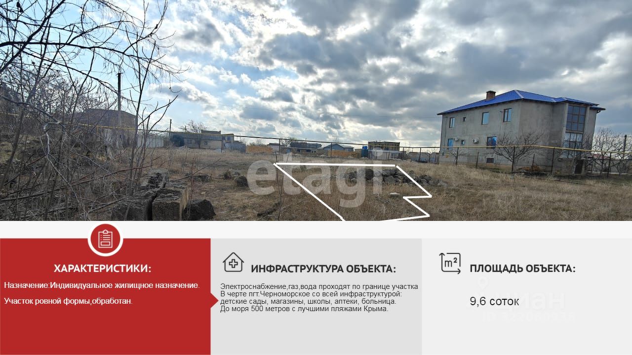 Участок находится в 600 метрах от моря. Черноморское - приморский поселок на западном берегу Крыма. В поселке хорошо развита инфраструктура: школы, детские сады, магазины, аптеки, МФЦ, спортплощадки. Самый красивый пляж с бирюзовой водой и белым песком. Хорошее транспортное сообщение во все стороны Крыма.