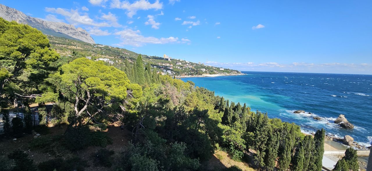 Недвижимость в Крыму! Квартира в Ялте у моря, 1 линия! Продаётся очень видовая квартира (с правом прописки) на берегу моря (1 линия), в самом живописном посёлке Ялты - в Симеизе! Квартира на 8 этаже 10-этажного дома, с общей площадью 53м², с качественным ремонтом, с мебелью и техникой! Панорамные окна, вид на море, горы и парк!!! Квартира состоит из кухни-гостиной , двух спален, санузла. Из двора комплекса удобный пологий выход на небольшой тихий пляж с мелкой галькой( 50 метров). До шумного большого городского пляжа и скалы Дива всего 4-5 мин ходьбы. Чистейший хвойно- можжевеловый воздух, т.к. вокруг комплекса санаторская парковая зона, чистое прозрачное море и тишина!