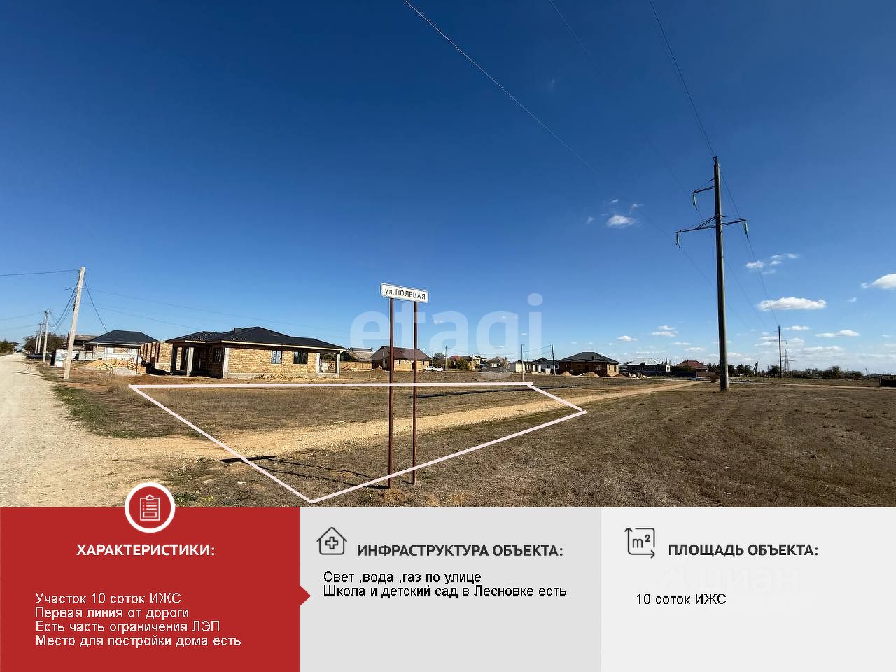 Земельный участок площадью 10 соток расположен в поселке Лесновка Сакского района, на первой линии , отличающемся динамичным развитием и перспективами. Участок находится на улице Полевая в сформированном жилом массиве, что гарантирует развитую инфраструктуру и спокойную атмосферу. Территория идеально ровная, полностью свободная от старых построек и насаждений, что предоставляет полную свободу для проектирования и строительства жилого дома с нуля согласно вашим предпочтениям. Ключевым преимуществом является готовность инженерных сетей: электричество уже подведено к участку и установлен счетчик, а по улице проходят магистрали газа и водопровода, что значительно упрощает и удешевляет процесс подключения.