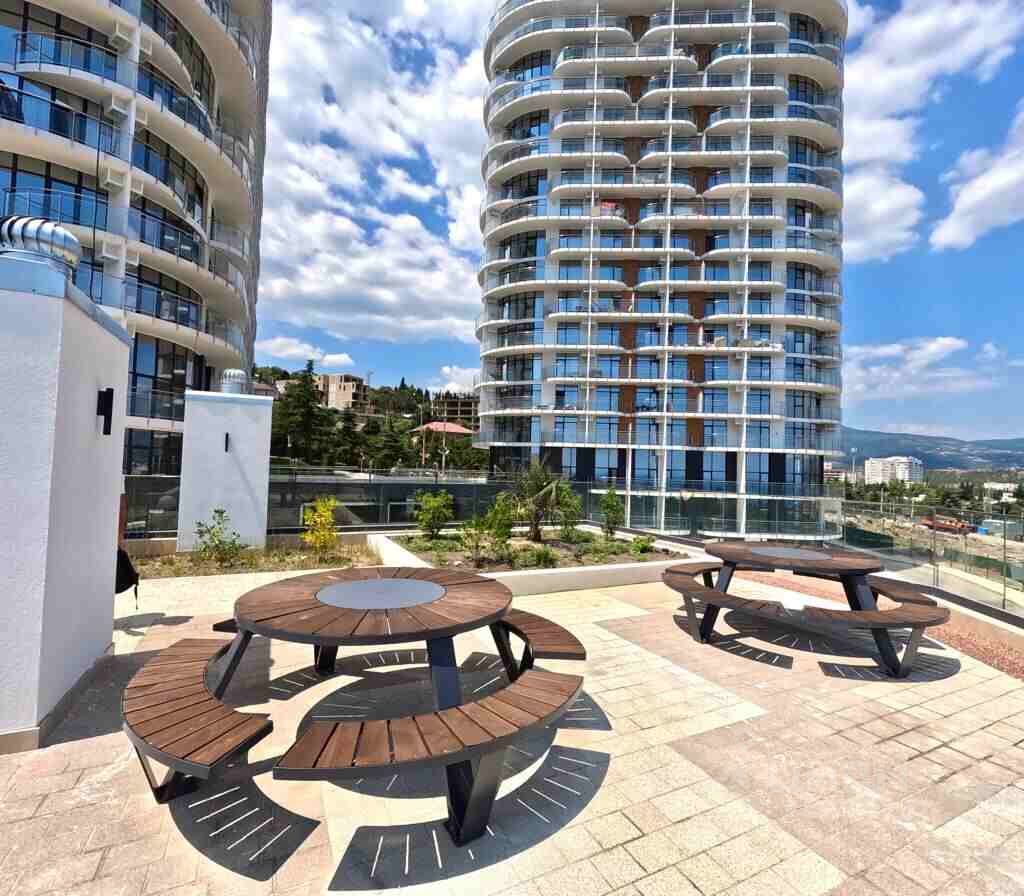3. Инфраструктура и локация уровня бизнес-класса — Охраняемая территория, подземная парковка, кладовые (келлеры) — 10 минут пешком до пляжа, рядом кафе, остановка общественного транспорта — Целебный воздух: море + кипарисовая роща — Отличная транспортная доступность — до центра, автовокзала и других пляжей