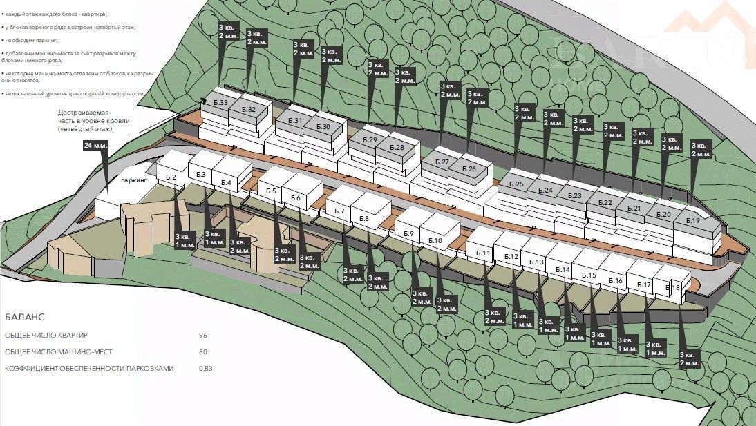 -Земельный участок очищен от растительности и подготовлен к началу строительных раот. Краснокнижные деревья пересажены, -Назначение земельного участка Блокированная застройка и ИЖС. Что позволяет строить как отдельно стоящие коттеджи, а так же и таунхаусы, -Сделан проект строительства на 32 жилых дома, площадью 6 200 кв.м., запроектирован бассейн, SPA зона, ресторан. -Сделан проект межевания земельного участка под застройку 32 жилых домов. -Проведены инженерно-геологические изыскания и противооползневые исследования. -Получены все технические условия необходимые для строительства 32 коттеджей. Коммуникации: