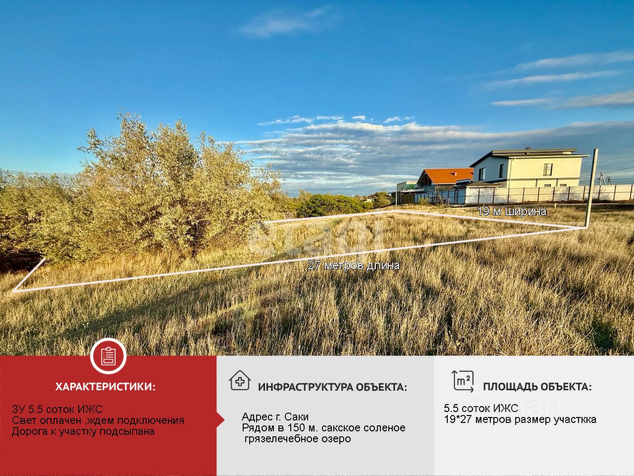 Продается земельный участок общей площадью 5.5 соток расположенный в очень интересном месте, рядом с грязе-лечебным озером в г. Саки. Земельный участок предназначен для индивидуального жилищного строительства (ИЖС). Электричество оплачено , центральный водопровод и газовая магистраль проходят по улице рядом с участком. Участок угловой, со склонным рельефом, свободен от построек , расположен в 4 км от моря, благоустроенных песчаных пляжей протяженностью 8 км. 310 солнечных дней в году, 6 месяцев длительность купального сезона. Отличные подъездные пути к участку, отличная транспортная доступность: центр города-курорта Саки - 1 км, Сакское грязе-лечебное озеро - 150 метров, трасса Евпатория-Симферополь, ж/д вокзал - 500 м. Пол часа езды до аэропорта и столицы полуострова г.