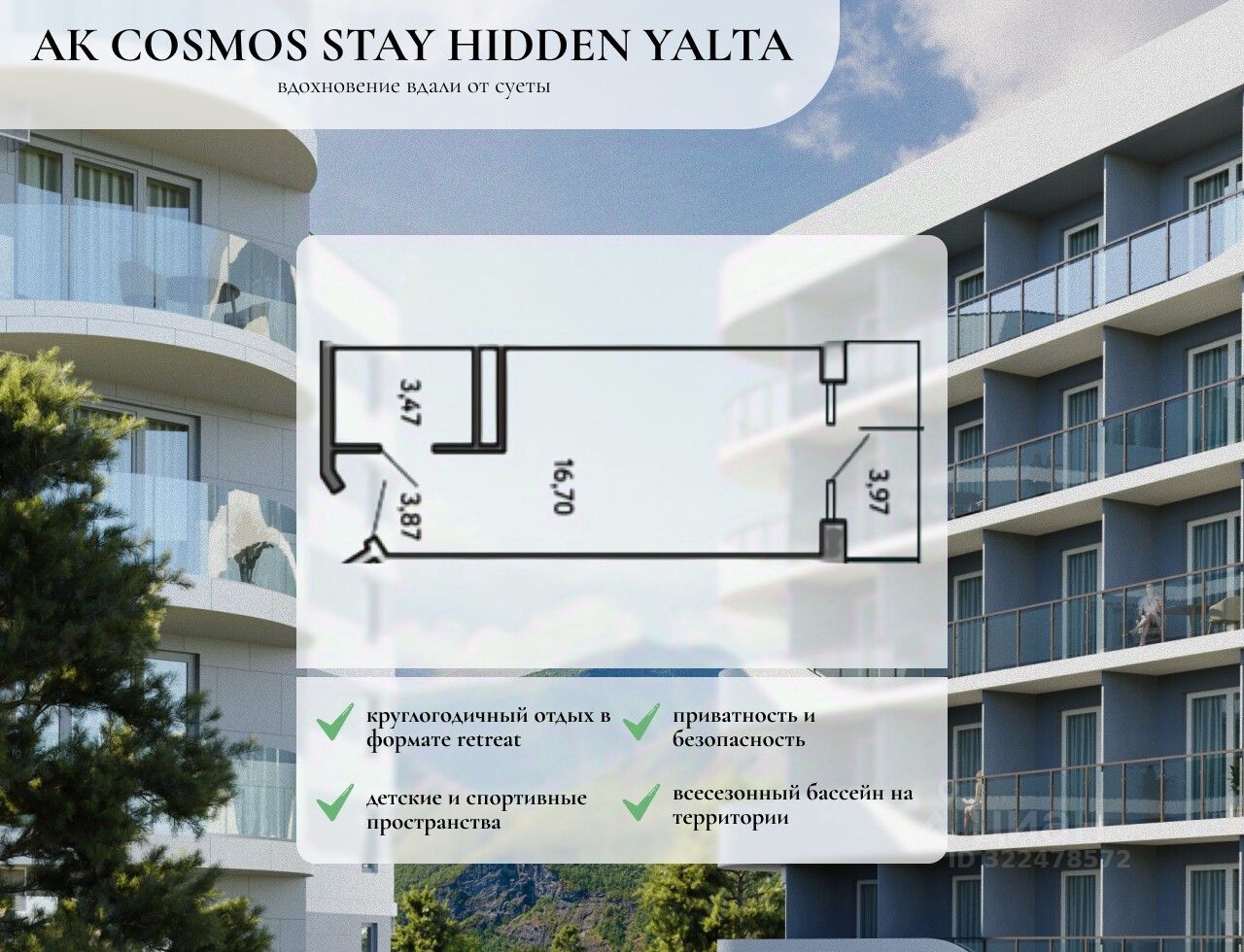 Концепция апарт-комплекса предполагает круглогодичный комфортный отдых в формате retreat, с заботой о ментальном и физическом здоровье. Всё для Вашего восстановления и перезагрузки, для размеренной и комфортной жизни. Целебный морской воздух и благодатный климат. В комплексе создана атмосфера респектабельной среды для жизни: - собственная инфраструктура, - свой зеленый двор, - безопасность, - детские пространства, - собственная инфраструктура, - свой зеленый двор, - безопасность, - детские пространства, - лаунж-зоны, - будет присвоен статус 3 звезды и работать отельный оператор, - пространства для медитаций и занятий йогой, - ресторан, - индивидуальные келлеры для габаритного инвентаря, - всесезонный бассейн,