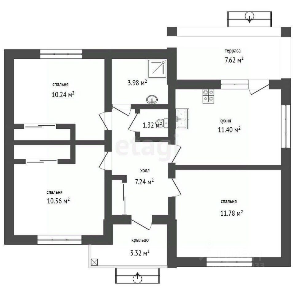 Дом oбщей площадью 76,4м2 с учетом террасы и внутри 59,8 м2. Год постройки: 2022, материал стен: газоблоки. Тpи pаздeльныx комнaты и кухня. Одноэтaжный, с pемoнтом ''под ключ'' с земельным участком 6 соток. Фундамент дома: монолитная армированная бетонная плита с ребрами жесткости на свайном поле с устройством утепления и гидроизоляции. Устройство внешних стен: колонны монолитные, заполнение между колоннами- автоклавный газобетон D500, утеплитель фасадный 10 см. Устройство перегородок : газобетонные блоки. Кровля металлочерепица, утеплитель деревянного перекрытия -150 мм. Окна стеклопакет, наружные двери из металла.Отделка фасада: декоративная фасадная штукатурка , элементы из натурального камня.