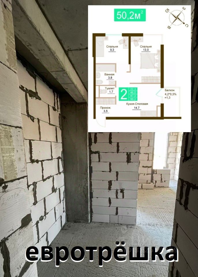 Прекрасная евротрёшка 50,2м2 в перспективном районе.