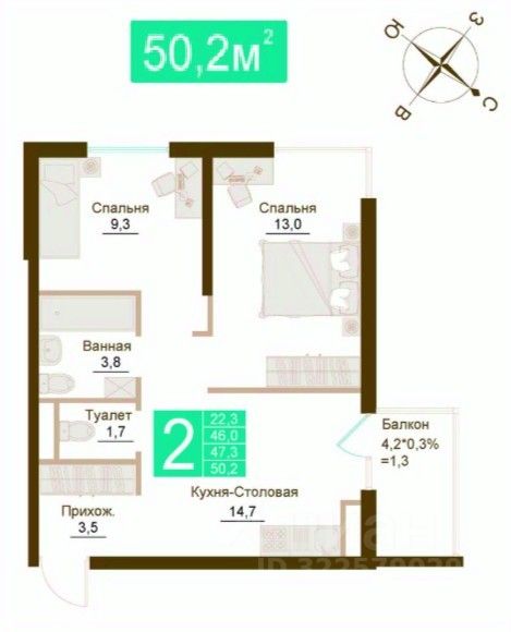 Большая кухня-гостиная 14,7м2 с выходом на панорамный балкон 4,2м2, две раздельные комнаты 9,3м2 и 13м2. Не упустите шанс стать собственником этой прекрасной квартиры, все детали по телефону.