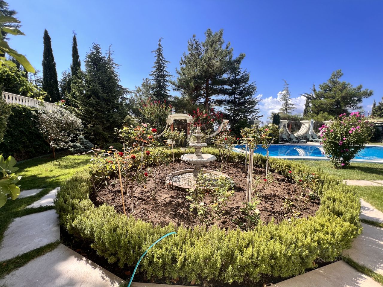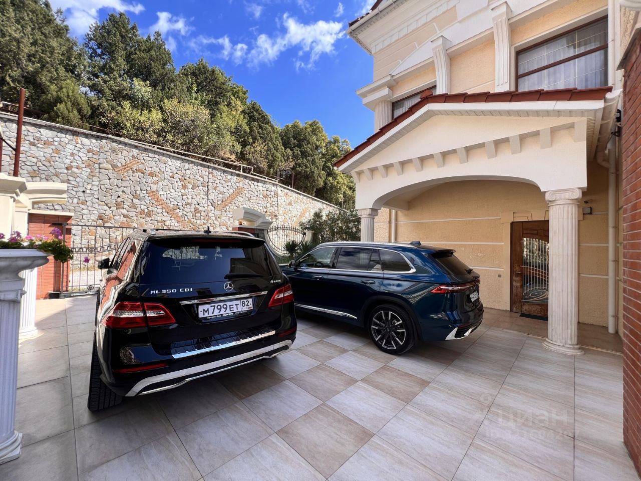 2 машины и открытая площадка на 4 авто, фонтан.