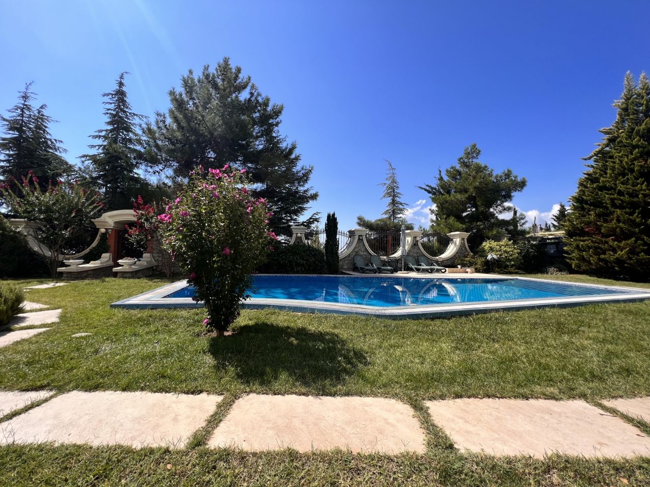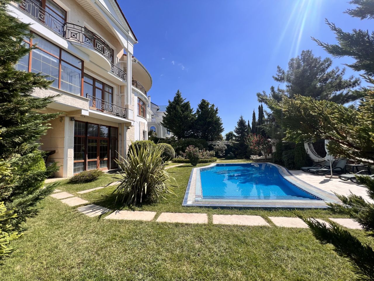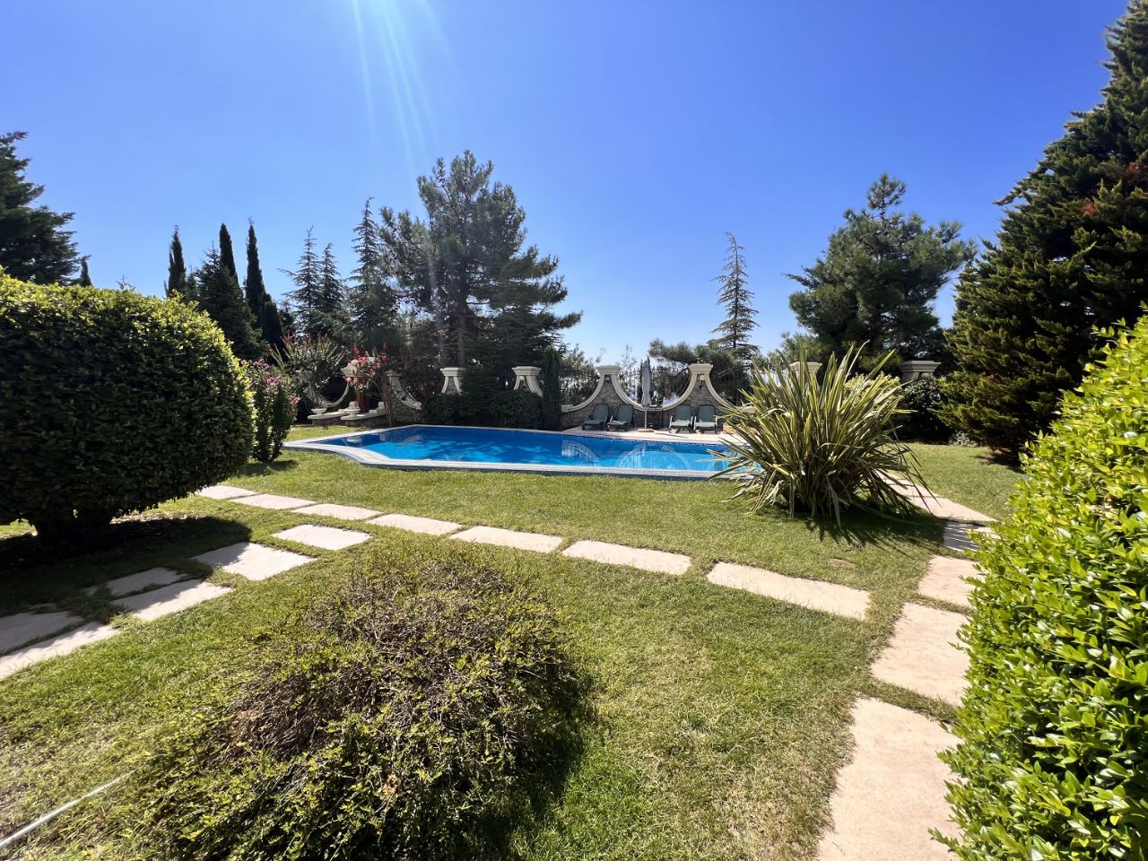В доме: 6 спален, просторная гостиная, каминный зал из белого мрамора, бильярдный зал с барной стойкой, открыта терраса с видом на море и горы.