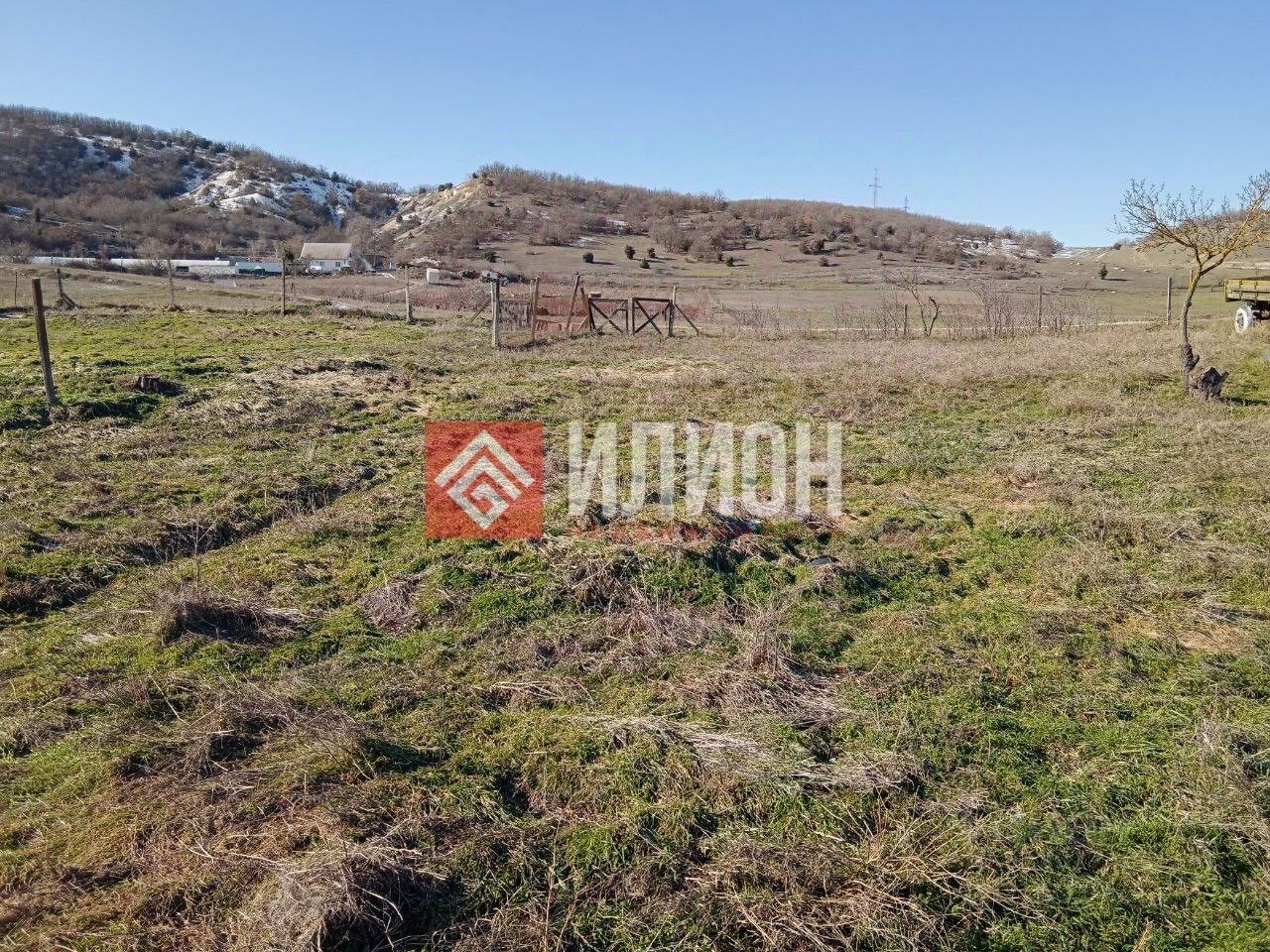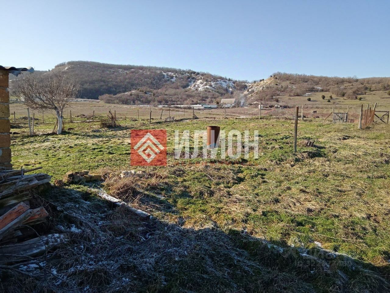 За участком сразу начинается поле и красивая гора покрытая лесом.