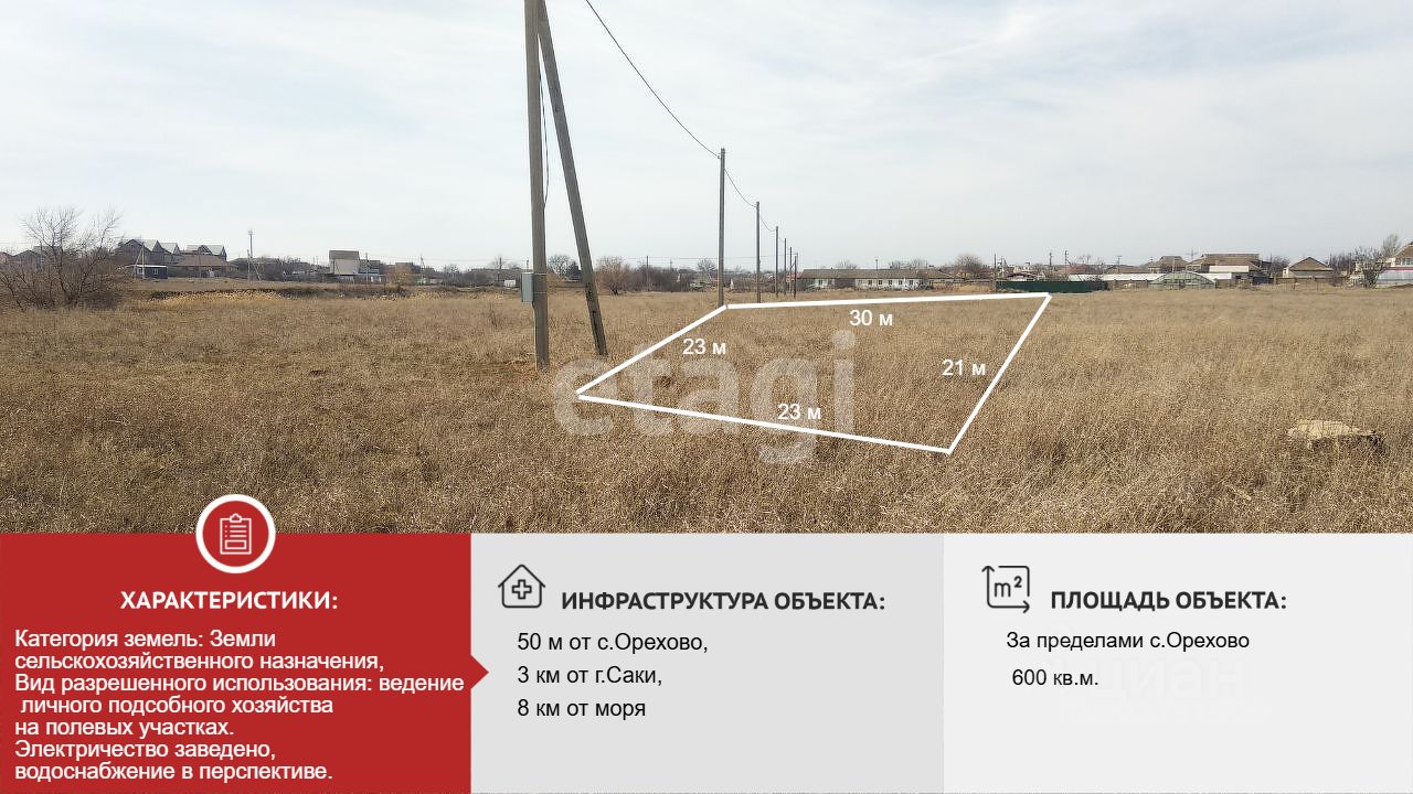 Участок площадью 6 соток для ведения личного подсобного хозяйства расположен в непосредственной близости от села Орехово, на расстоянии 50 метров от его границы. Земля находится в частной собственности, межевание проведено, границы четко определены. Ключевым преимуществом является уже подведенное электричество, что обеспечивает базовую инфраструктуру для освоения территории. В перспективе планируется проведение центрального водоснабжения, что значительно повысит комфорт использования. Рассматривается вариант перевода участка в категорию земель для садоводства, что расширит возможные направления его использования. Важным фактором является транспортная доступность и близость к морскому побережью: до пляжей Черного моря всего 8 км, что делает это место привлекательным для сезонного отдыха или строительства загородного дома. Участок не разработан, что предоставляет новому владельцу полную свободу для планировки и реализации собственных проектов с нуля. Так же можно приобрести смежный. Оперативный показ.