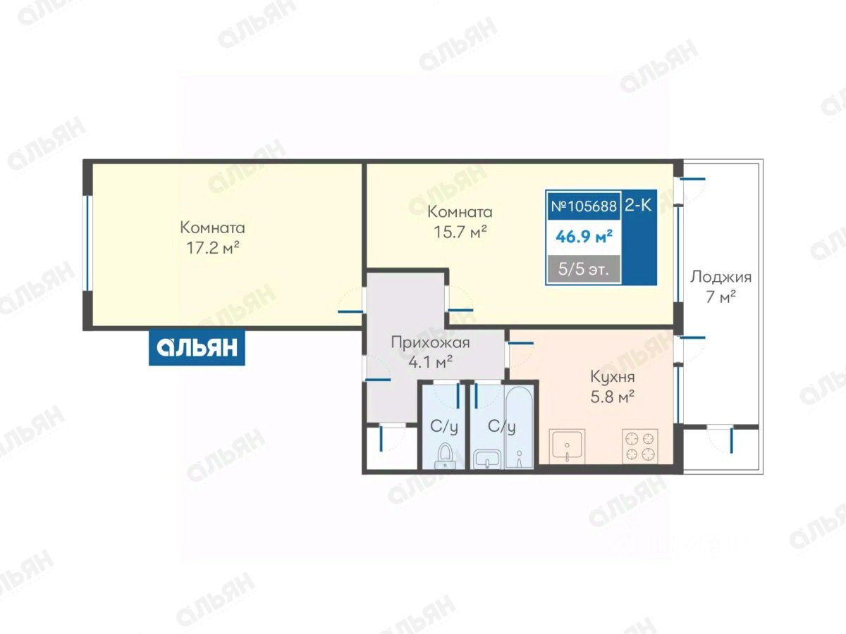 Кухня 5,8 м2, санузел раздельный: туалет 1,1 м2, ванная 2,1 м2, коридор 4,1 м2, комната 17,2 м2, комната 15,7 м2, лоджия 7 м2.