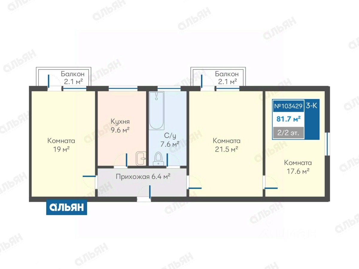Прихожая 6,4 м2, санузел совмещенный 7,6 м2, кухня 9,6 м2, комната 19 м2, 21,5 м2 и 17,6 м2, два открытых балкона по 2,1 м2.