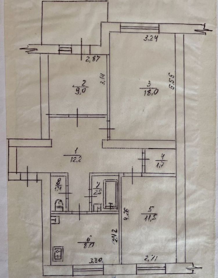 Площади помещений: кухня 8 м2, спальни 9 и 12 м2, зал 18 м2.
