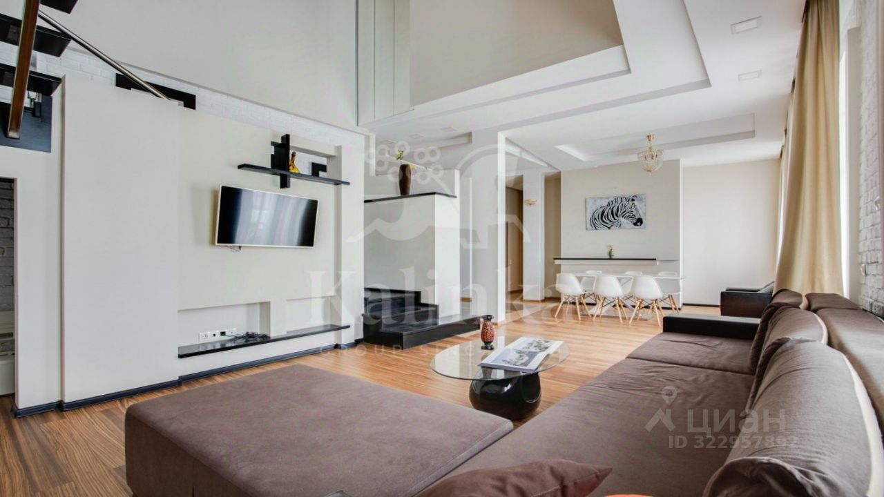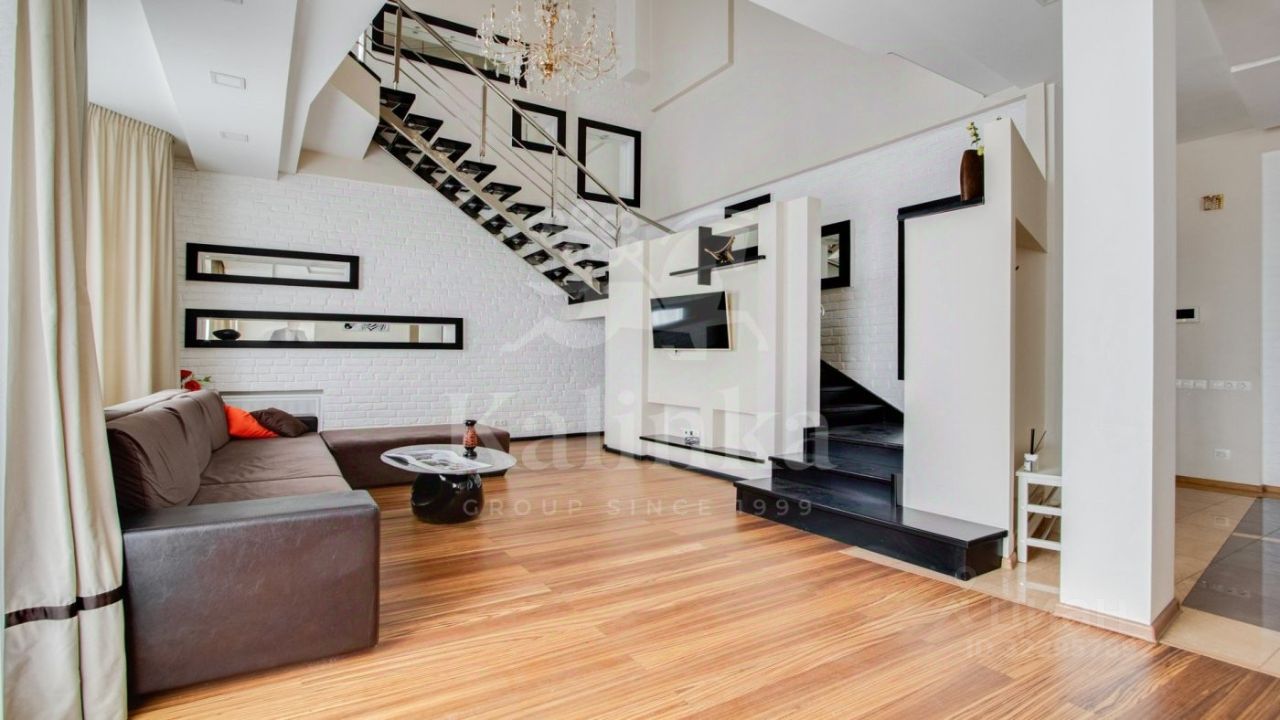Планировка: 1-й уровень: гостиная со вторым светом, 3 балкона, кухня-столовая, 2 санузла, 2 гардеробные, 2 спальни, постирочная, два входа в квартиру. 2-й уровень: кухня-гостиная, санузел, мастер-спальня с собственной гардеробной и ванной комнатой, имеется отдельный вход только на этот уровень. Антресоль: изолированная комната с подиумом.