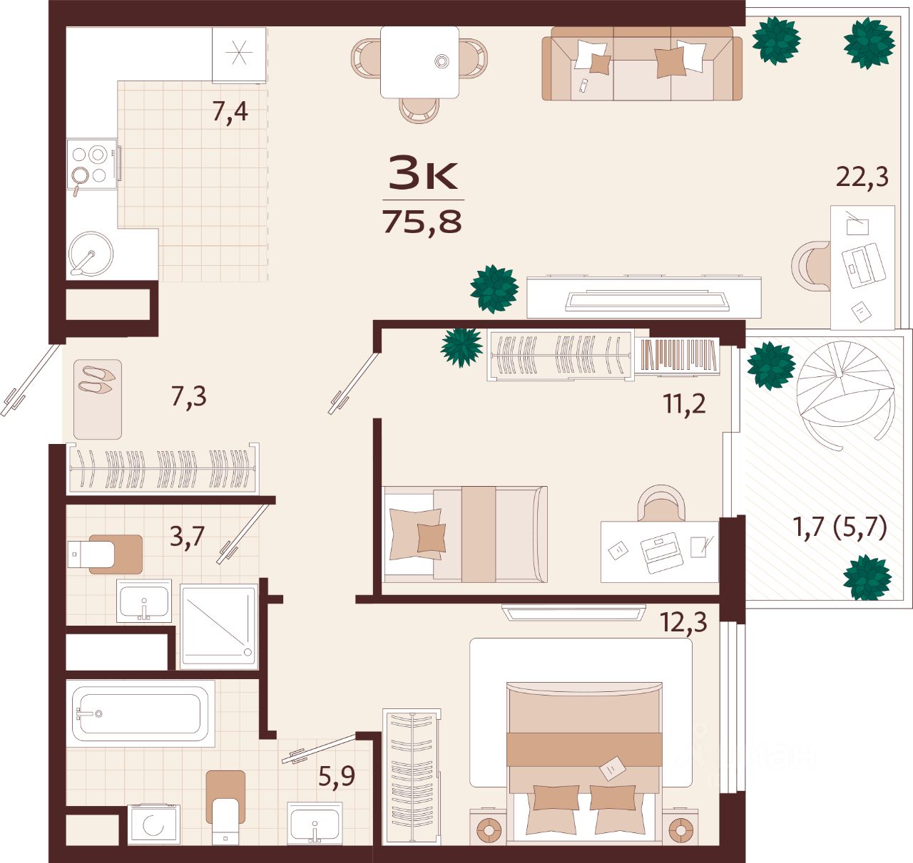 Продаётся 3-комнатная квартира в строящемся доме (Корпус 1), срок сдачи: II-кв. 2027, общей площадью 75.8 кв.м., на 4 этаже. Жилой комплекс бизнес-класса ''РОЯЛТА'' от застройщика ''ГК ТОЧНО'' в городе Ялта Республики Крым на улице Спендиарова.