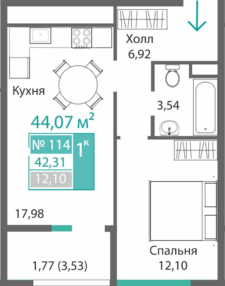 Общая площадь42,31 м2