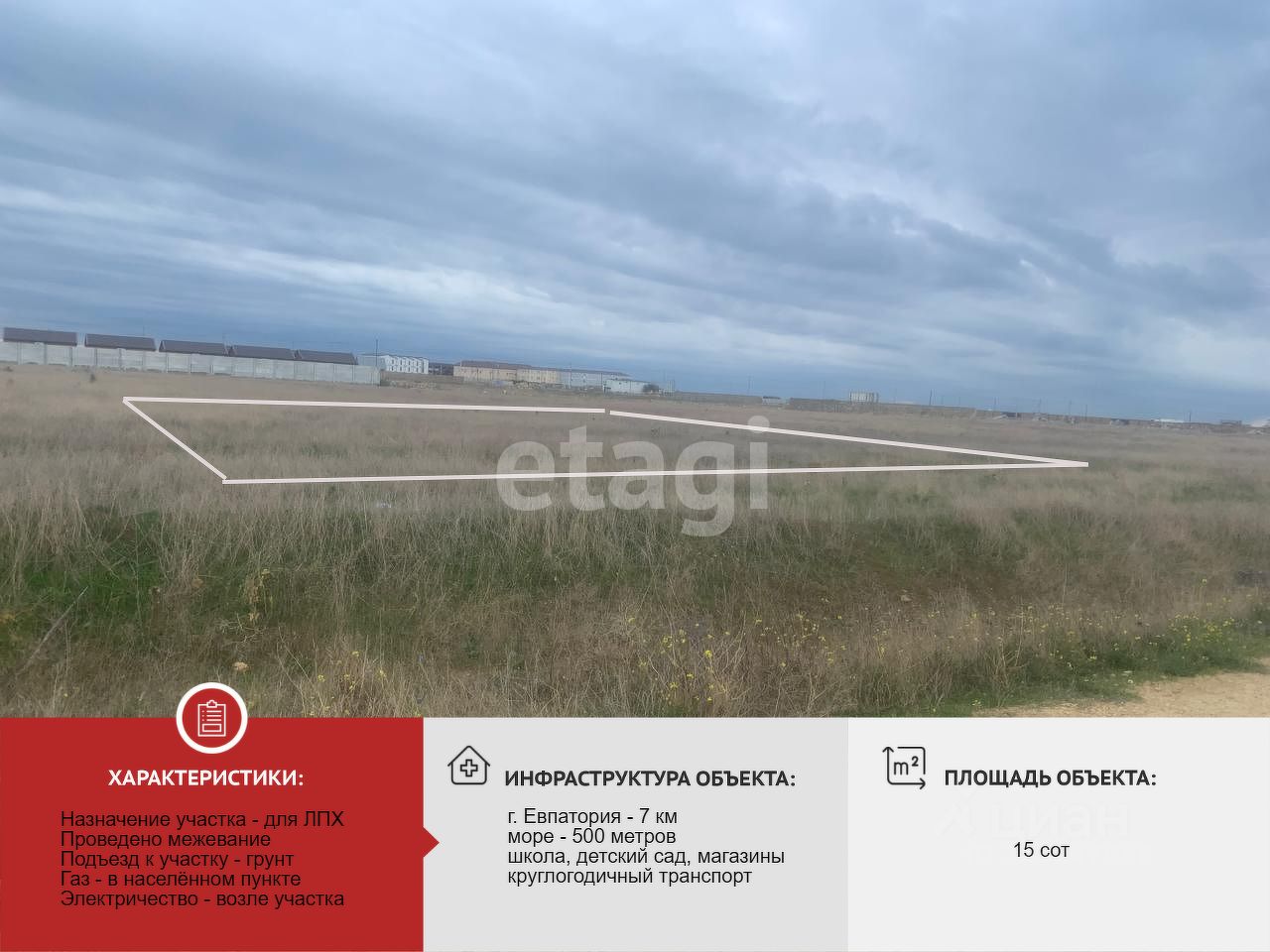 До Евпатории 7 км. Участок находится в хорошо развитом курортном поселке, до моря пешком 5 минут, 500 метров. Электричество по улице, газ есть в поселке.