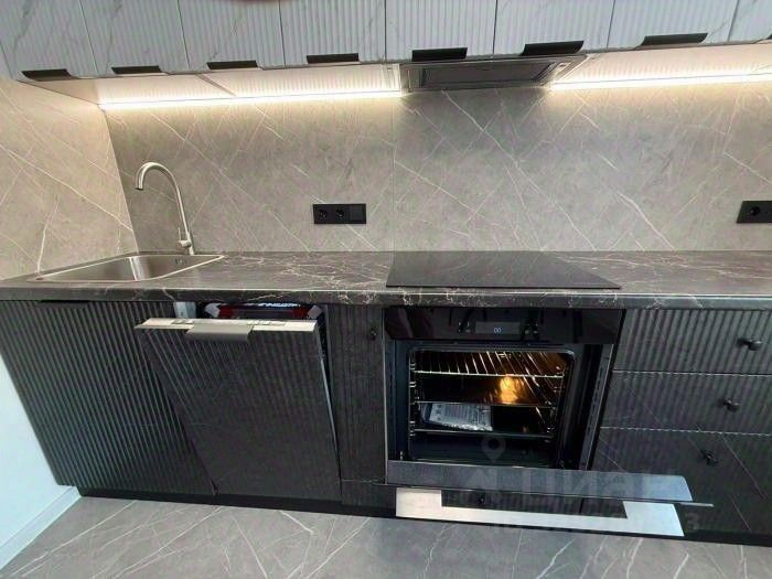 Квартира в качественным ремонтом: стильные обои, керамогранит и ламинат, натяжные потолки, металлическая входная дверь и современные металлопластиковые окна. Оснащение квартиры включает теплые полы, посудомоечную и стиральную машины, холодильник, духовку и индукционную варочную поверхность, 2 телевизора и 2 кондиционера.