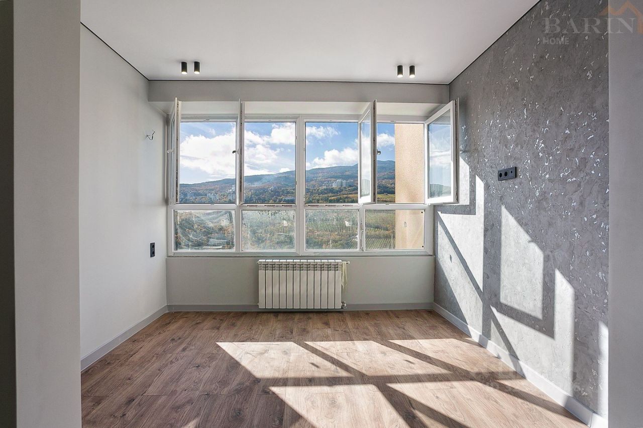 Квартира расположена на 11-м этаже, за счёт этого не слышно шума города, что позволяет спать в тишине с открытыми окнами. Из квартиры открывается роскошный вид на виноградники и горы. За счёт того, что оконные проёмы увеличенной площади можно наслаждаться видами не поднимая головы с подушки. Квартира удачно зонирована. Выделена спальная зона у окна, уходя немного вглубь квартиры расположена выделенная гостиная, за которой кухня-гостиная, далее совмещённый санузел и отдельная гардеробная комната. В квартире выполнен дизайнерский дорогой ремонт.
