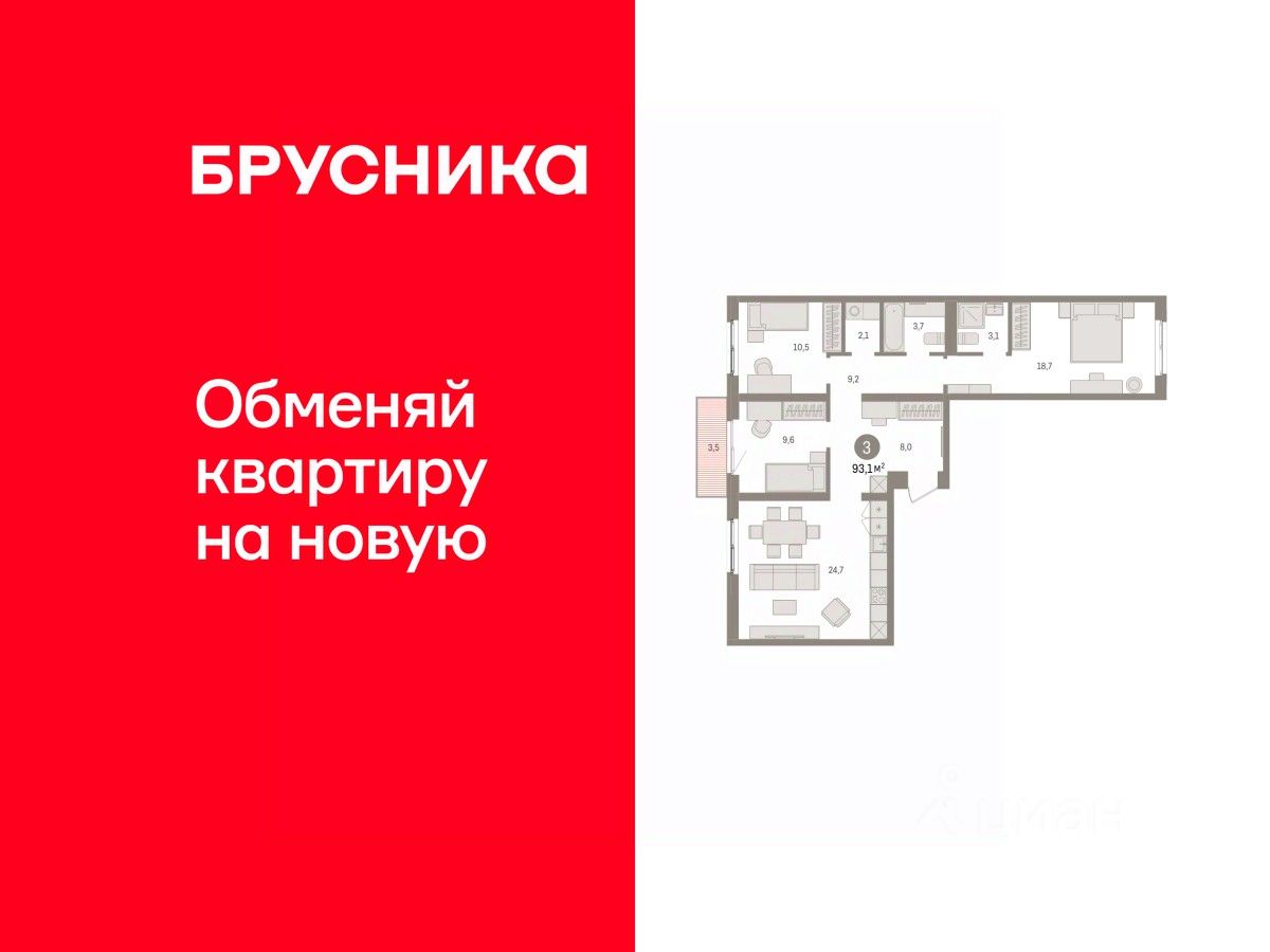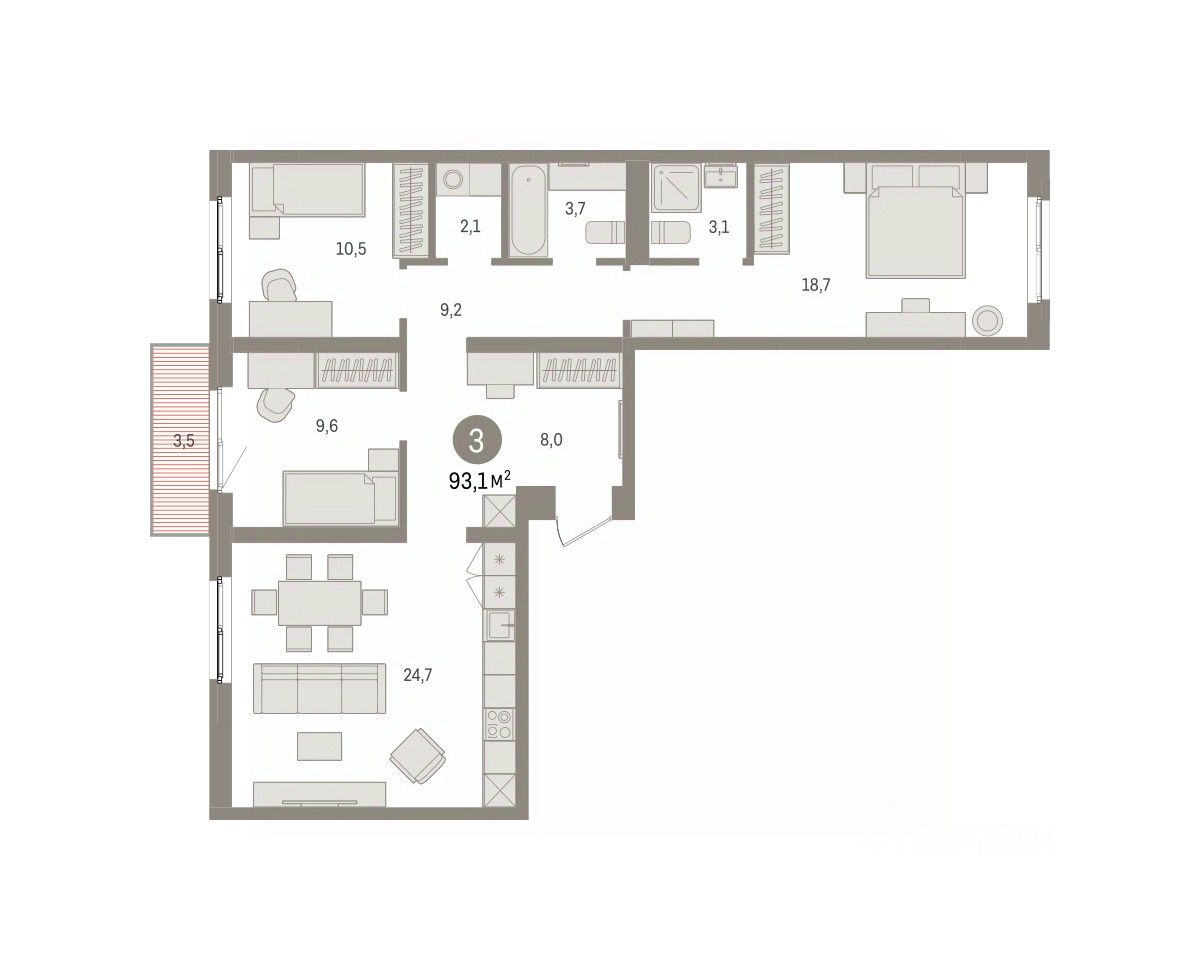 Квартира с кухней-гостиной и тремя спальнями в Южных кварталах. Особенности планировки: балкон, окна на две стороны, предчистовая отделка, разнесённые спальни. квартиры в нашей базе: ЮКВ08-Ж5.3.1.