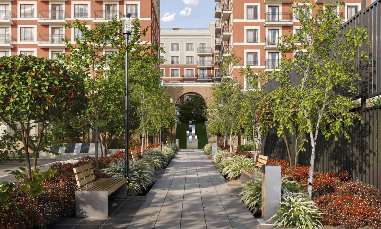 Двор с выходом в сквер Двор - это приватное пространство для жителей, закрытое от машин. В нём спроектированы детская и спортивная площадки, выполненные из натуральных материалов, а также зоны отдыха. Прямой выход в городской сквер расширяет функционал двора. Жители смогут быстро попадать в общественную зону с фонтаном, детскими и спортивными площадками и местами для отдыха. Большую часть территории двора занимает зелень. Озеленение выполнено в стиле пэчворк, и вдохновлено техникой лоскутного шитья. Отдельные фрагменты ландшафта, подобно лоскутам, гармонично складываются в планировочные элементы, а затем формируют цельную композицию
