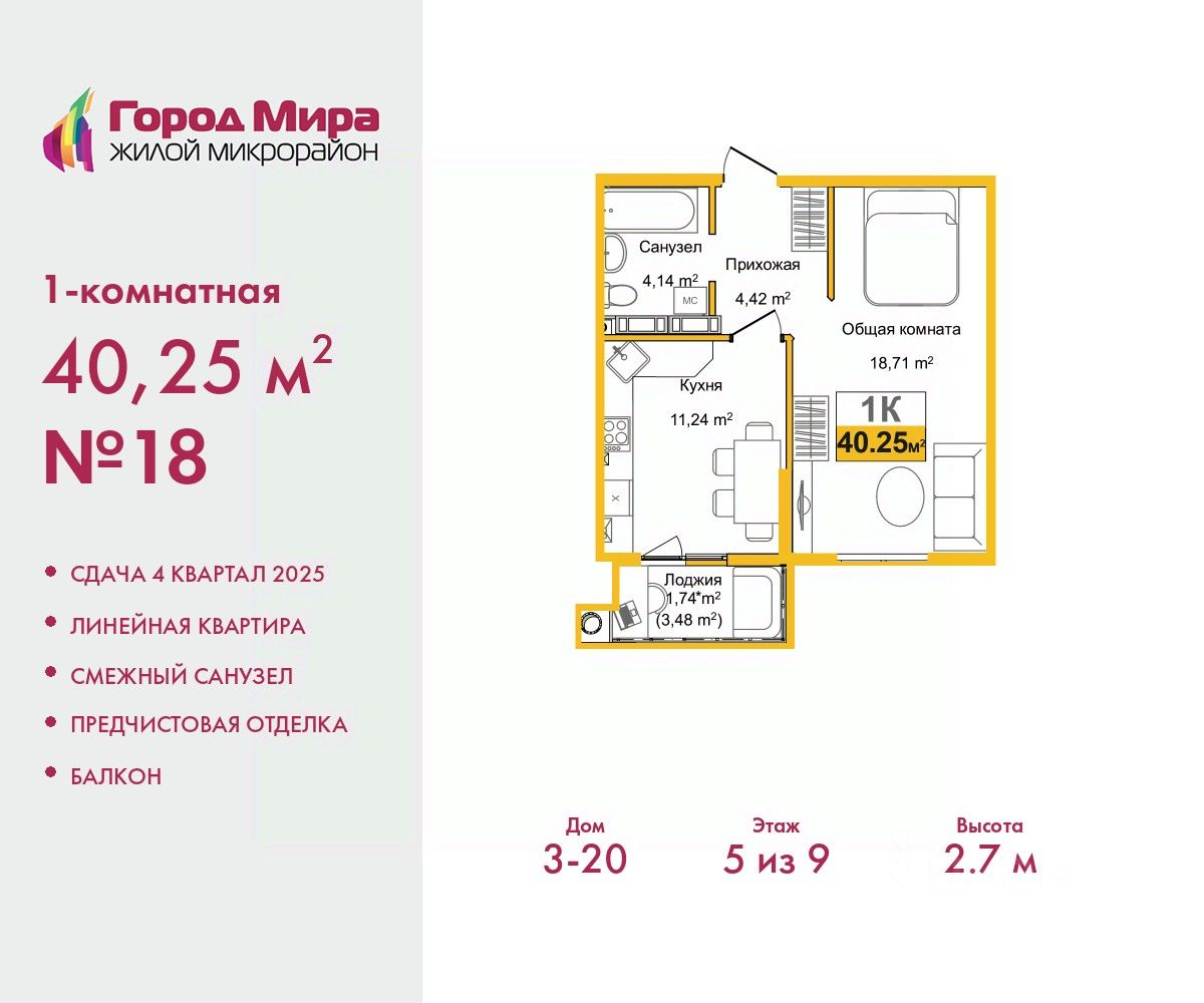 1-комн. квартира с предчистовой отделкой в ЖМ ''Город Мира'' на 5 этаже. Общая площадь: 40.25 кв.м., жилая: 18.71 кв.м., площадь просторной кухни-столовой: 11.24 кв.м. Все окна выходят на одну сторону. В квартире один балкон, один совмещенный санузел. Высота потолков 2.8 м.