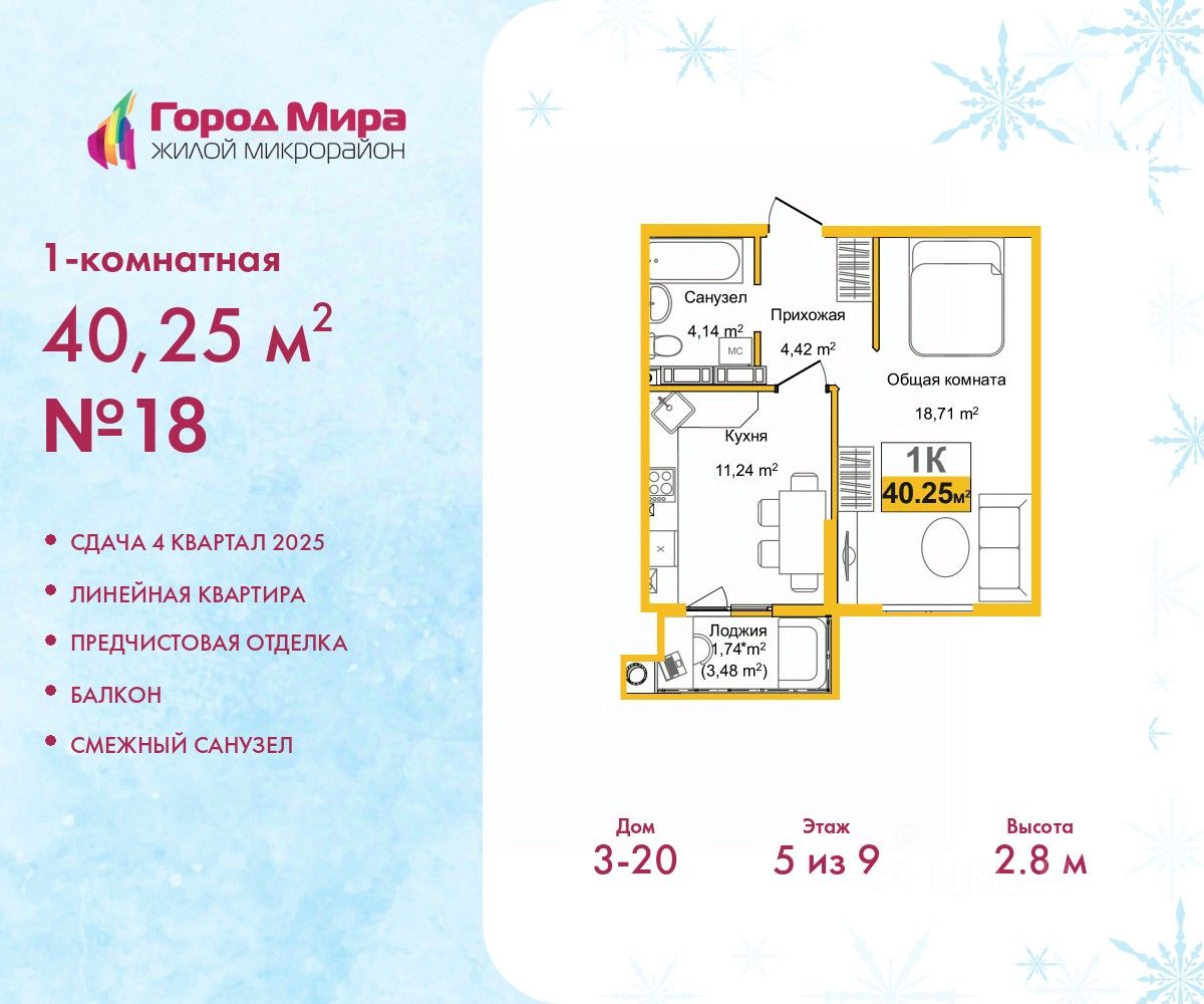 1-комн. квартира от застройщика с предчистовой отделкой в ЖМ ''Город Мира'' на 5 этаже. Общая площадь: 40.25 кв.м., жилая: 18.71 кв.м., площадь просторной кухни-столовой: 11.24 кв.м. Все окна выходят на одну сторону. В квартире один балкон, один совмещенный санузел. Высота потолков 2.8 м.
